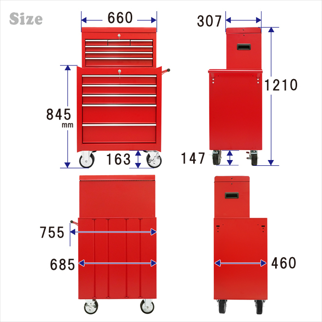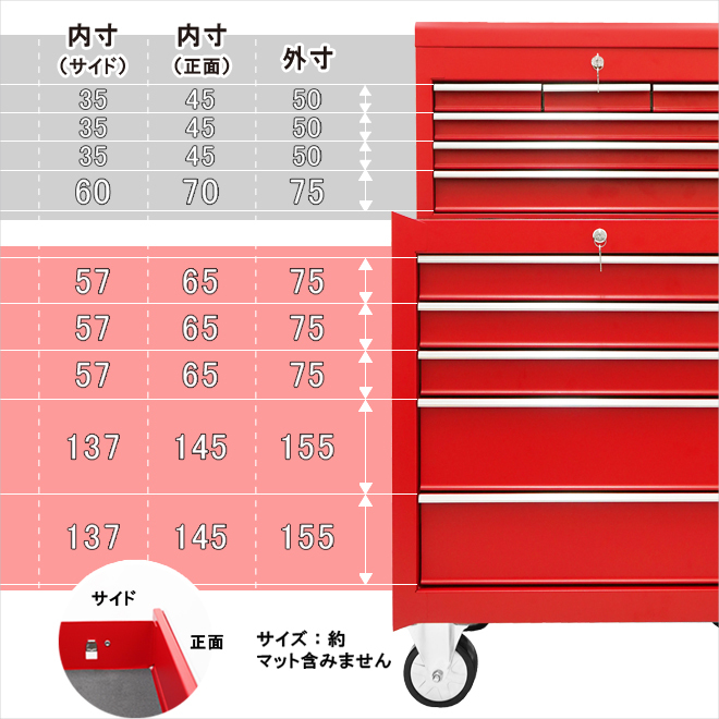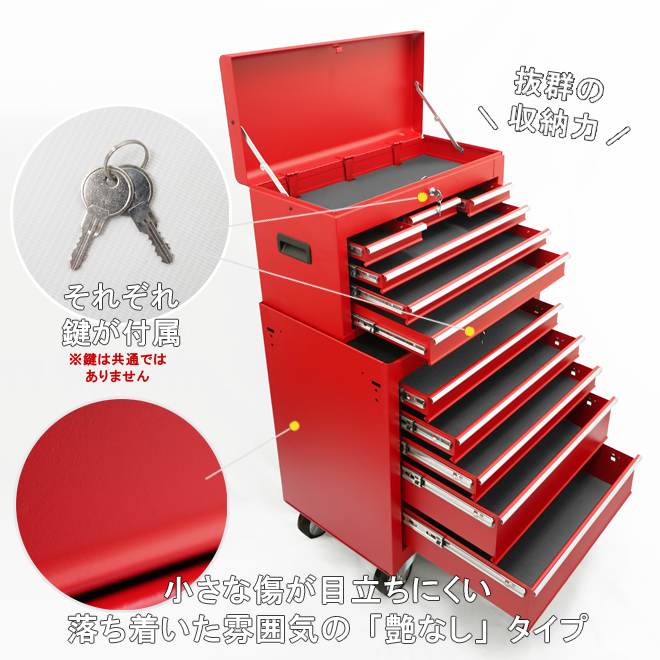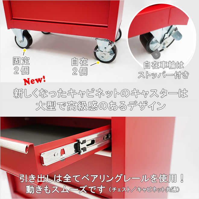 ●セットでお得!収納力抜群のチェスト&キャビネットセット メカニックやDIYなど、整備工具や修理道具の整理整頓に ●小さな傷が目立ちにくい、落ち着いた雰囲気の「艶なし」タイプ ●キーにより全段ロック可能(※鍵は共通ではありません) ●引き出しは全てベアリングレールを使用し、スムーズに動きます 引き出しを押し込む事で軽くキャッチになり、飛び出し防止になります ●キャビネットは天板部分にゴムマット、引き出し部分に中敷きマットが付いています チェストはトップパネルオープン部分、引き出し部分に中敷きマットが付いています ●新しくなったキャビネットのキャスターは大型で高級感のあるデザイン 樹脂車輪は丈夫で転がりやすく、自在キャスター(2個)はストッパーが付いています ●キーにより全段ロック可能(※鍵は共通ではありません) ●KIKAIYAロゴステッカー付き 【 引き出し開閉について 】 ・上段のチェストは、トップパネルを完全に開いた状態で引き出しを開閉してください 引き出しはトップパネルを閉じる事でロックがかかります ※キャビネットのハンドル・キャスターはお客様での取付けとなります (取付け工具はお客様でご用意下さい) |