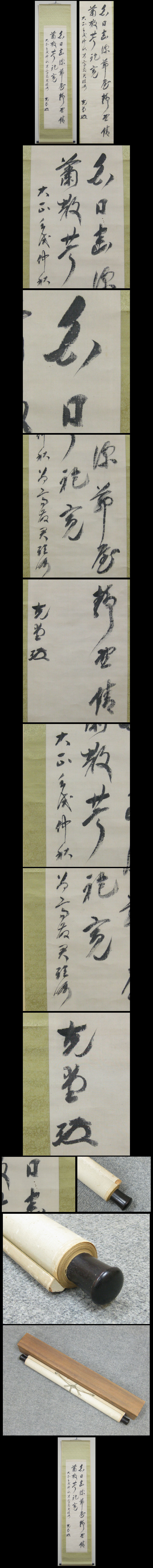 【若槻克堂(礼次郎)】1866~1949 政治家。島根の生まれ。蔵相・内相を歴任。 大正15年(1926)首相となるが金融恐慌の対策を誤り、枢密院の画策もあって総辞職。 のち、第二次内閣を組閣したが、満州事変が勃発し、退陣。 ★商品サイズ★ ■掛軸 215×50cm ■作品 153×35.5cm ★商品の状態★ 作品・表具共に少しのしみ汚れがあります。 八双の裏側に少しのソゲがあります。巻緒が短めです。 ご承知のうえご入札をお願いします。 時代など詳しくは画像にてよく確認のうえでご検討いただければと思います。 どうぞよろしくお願いいたします。 |