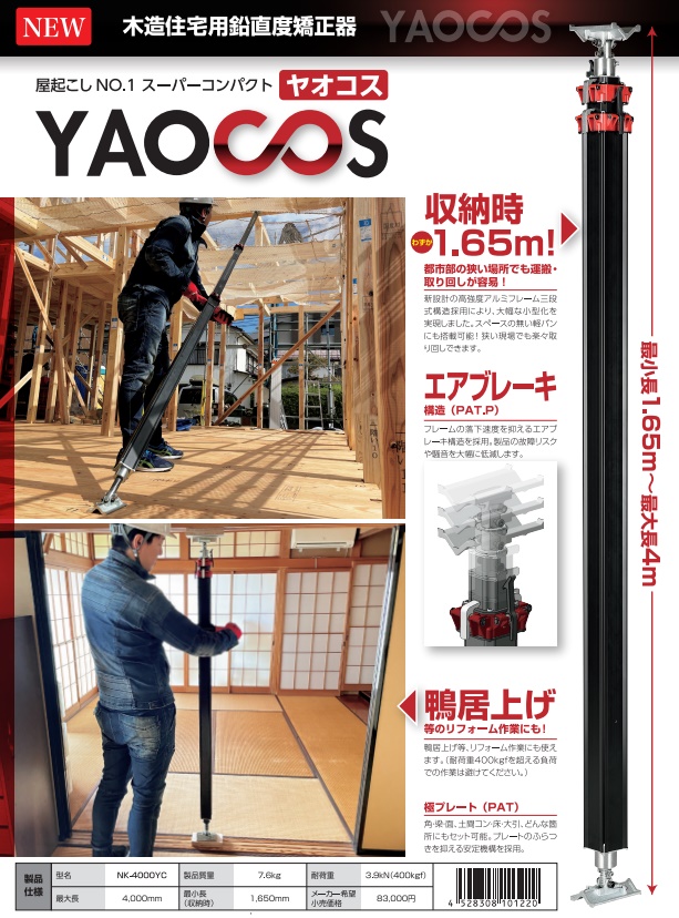 ナカヤ NAKAYA屋起こしNo.1スーパーコンパクトYAOCOS(ヤオコス)NK-4000YC■収納時長 わずか1.65m !・都市部の狭い現場でも運搬・取り回しが容易、リフォームでも使える万能型屋起こし器 ! ◎法人限定販売◎法人の方のみの販売になります。購入時、必ず法人名を記入下さい。一般運送便になりますので、配達時必ずご在宅頂く必要が御座います。その為、電話番号はいつでも連絡が取れる番号でご登録下さい。配達時間も指定出来ませんのでご注意下さい。配達前に事前TEL連絡は可能です。ご希望のお客様は、注文時ご要望欄にご記入お願いいたします。再配達は出来ません。ご不在の場合、送料が加算される場合がありますのでご了承下さい。他商品を追加購入頂いて合計金額2万円(税別)以上になりましても送料が発生します。北海道・沖縄・離島発送も出来ませんのでご注意ください。また代引決済は出来ません。