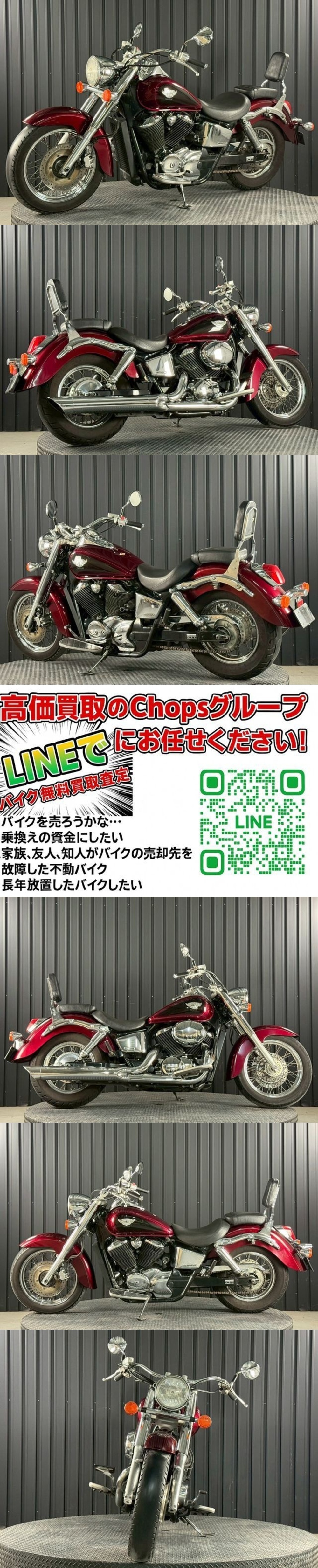 | ★こちらの車両は現状販売の車両です★ 現在の価格はご納車前の整備やナンバー登録は行わずに、弊社仕入れたそのままの状態の車両をご購入頂く「現状販売価格」となっております。 従いまして、そのままの状態では道路交通法等の法令に抵触している場合がございますので「現状販売価格」で車両をご購入頂いた場合には、ご購入者様にて適切な整備やナンバー登録を行なって頂いてから公道走行を行なって頂く必要がある点にご留意下さい。 こちらの車両は当社販売店舗または保管倉庫において、直接販売をしています。 また、GOOBIKE等でも展示・併売しております。 ご落札やご連絡をいただいた時点で売約済み・商談中となっている場合もございます。 お手数かとは思いますが、必ず商品説明欄をお読み頂き「電話・LINEにて在庫確認」 又は 「ご来店にて現車確認」をお願い致します。 オークションページの画像以外にも詳細な画像や小キズ等の画像を掲載しております。 【Goobikeでの掲載ページはこちら】 1ヶ月保証/登録代行/整備付等のプランをご希望の場合や、車両状態のお問い合わせ、ご購入の相談、オートローンのご相談等につきましては販売店までお問い合わせください。 〒569-1051 大阪府高槻市原2232-3 TEL:072-689-5000 Email:chopstakatsuki@gmail.com 営業時間:10:30~19:00 定休日:第1.3.5火曜日、毎週水曜日 より詳細な写真や動画は、LINEからもお送り出来ますので、お友達登録後、こちらのページの情報をお知らせください。 ID:@898gdlsq IDで追加できない方は、以下URLから追加できます。 https://lin.ee/PXRViuG 【Goobikeでの掲載ページはこちら】 ●登録・書類について 表示価格は現状販売での車両本体価格になりますので、登録代行・車検をご希望の場合、ご納車までに別途諸費用が必要です。 詳しくは販売店へご相談ください。 ・現状販売の場合 車検切れ車両/車検なし排気量の車両廃車証(返納証明書)と譲渡証をお渡しいたしますので、購入者様にてご登録手続き等をお願いいたします。 車検が残っている車両:名義変更が完了してから車両をお渡し(配送手配)をいたします。 弊社で整備や登録、車検、名義変更手続きを代行する場合は別途費用をいただきます。 ●現車確認は随時受け付けております。現車を確認せずにご落札・ご購入いただいた場合、掲載していない不具合含め如何なるクレームも承ることはできません。あしからずご了承くださいませ。 ●現車確認ご希望の方は、直接販売店までお問い合わせください。 ★で落札・お取引きいただく場合★ 落札いただいたとしても、店頭で商談中・売約済みの場合やバイクショップ様・業者様にて売約の場合もあります。店舗での販売を優先しています。 入札前には必ず在庫の確認をお願いします。 でご落札いただいた場合は現状販売のみでのお引渡しとなります。 追加料金をいただいても整備等は承ることができませんので、あらかじめご了承くださいませ。 整備や登録等をご希望の場合は販売店にてご契約をお願いいたします。 ご納車前の整備やナンバー登録は行わずに、弊社仕入れたそのままの状態の車両をご購入頂く「現状販売車両」となっております。 従いまして、そのままの状態では道路交通法等の法令に抵触している場合がございますので「現状販売価格」で車両をご購入頂いた場合には、ご購入者様にて適切な整備やナンバー登録を行なって頂いてから公道走行を行なって頂く必要がある点にご留意下さい。 ●書類について 車検なしの車両、車検切れの車両については、廃車証(返納証明書)と譲渡証をお渡しいたします。 で落札された場合、登録代行、車検、予備検査等はいたしません。 車検が残っている車両は名義変更が完了してから車両をお渡し(配送手配)をいたします。 ●車両のお引渡しについて 発送地域・方法が確定してから送料をご案内いたします。 ①アイラインさんまたは弊社指定の配送業者さんによるご自宅まで配送 ②BASさんによるデポ間配送 ③高槻市の弊社倉庫にてお引渡し ①または②の配送でお渡しの場合、お手元に到着した時点で商品の確認をしてください。 商品状態は目視で確認できた状態を記載させていただいております。 下記に記載しておりますが「停止状態での車両チェック」が基本の現状販売となります。 配送の場合は「配送業者より受け取り、受領サインをする前」に必ずご連絡ください。 ※「配送業者より受け取り・受領サイン後」は一切補償ができませんのでご注意ください。 ★現状販売の注意事項 中古車両ですので、サビ、キズ、ワレ、汚れ、経年劣化、カメラ、PC環境による色味の違い、また価値観の違いも含めて感じ方の相違は必ずあります。 神経質、几帳面な方、店頭販売の中古車と同じクオリティーをお探しの方などはご入札されない様お願い致します。 見落とし、記載もれなどありましても現物優先になりますので細かいキズなどが気になる方は現物確認に是非お越し下さい。 陸送による納車
