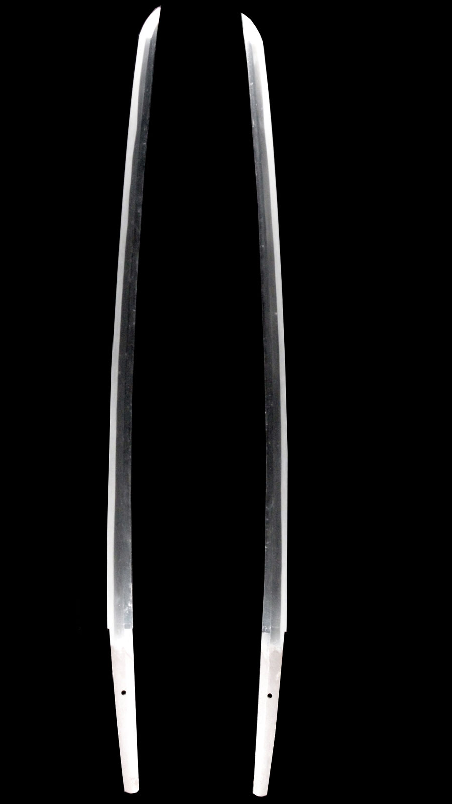 刀身長:約82.4cm 反り:約1.6cm 目くぎ穴:1個 元幅:約34.8mm 元重:約8.3mm 先幅:約23.8mm 先重:約4.8mm 刀身重:約1033g 棟:庵棟 ハバキ:銅 |