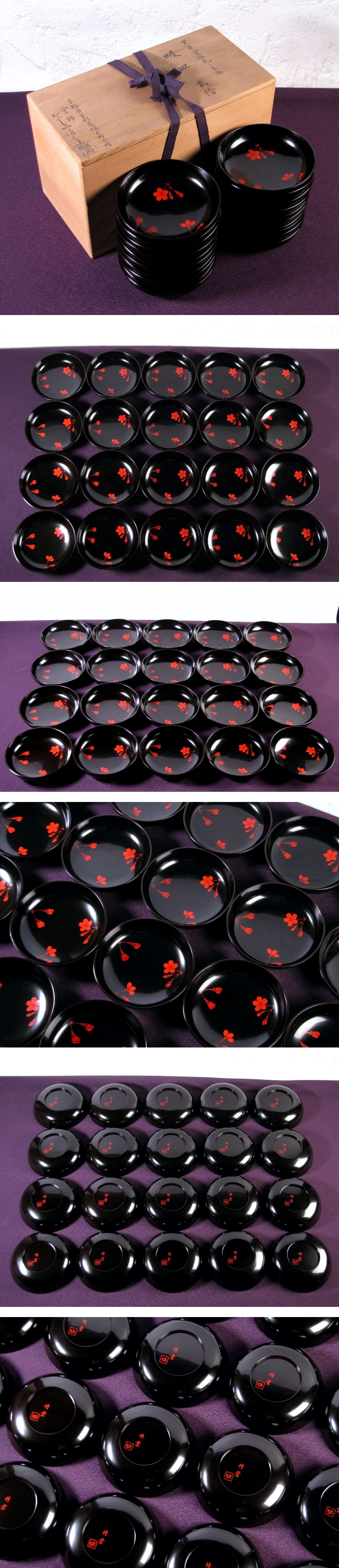 堅地屋清兵衛作 黒新塗桜花朱画吸皿20客 幅:12.2cm 美品 共箱/26a039 收藏