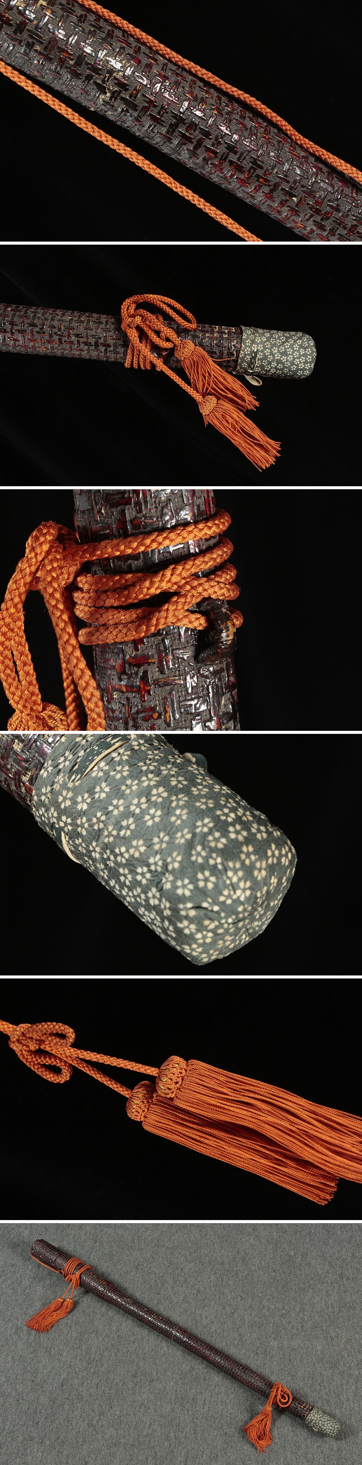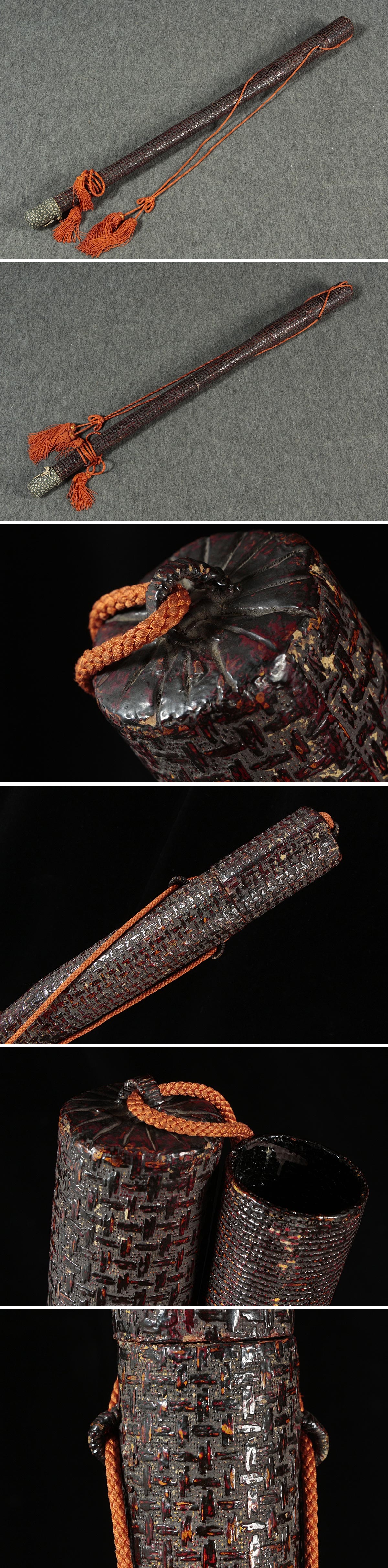 | ◆ 時代弓道具 紙縒り編 / 漆塗 矢筒 鹿革製石突付 全長101cm / 深93cm・紙縒り矢筒 弓道 矢収納具 ◆
