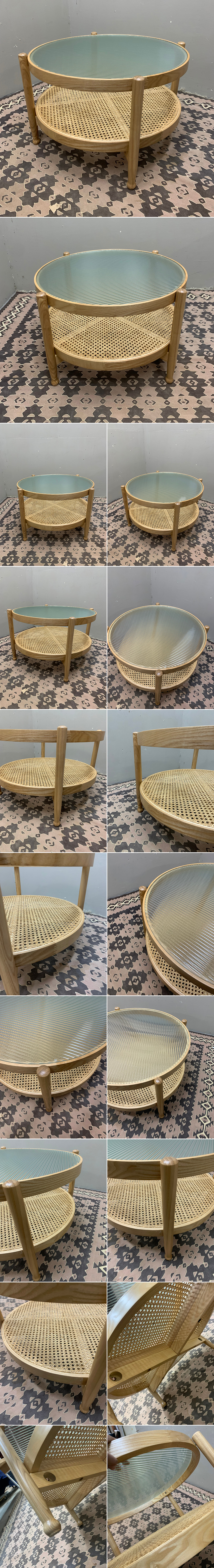 ■EM036A/未使用保管品/北欧スタイル/ラタン&ガラス/ラウンドテーブル/サイドテーブル/コーヒーテーブル/木製/籐編み/棚付き/ナチュラル 收藏