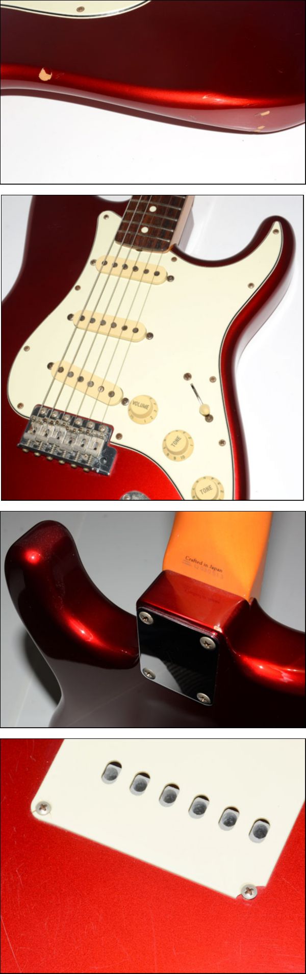 ・ボディ正面、側面、背面にスレ、キズ、打痕、塗装はがれが見られます。 (画像にてご確認ください。) ・ボディ底面に多少のスレ、キズ、打痕が見られます。 ・ネックに多少のスレ、小キズ、僅かな塗装はがれが見られます。 ・ネックジョイントに僅かな塗装クラックが見られます。 ・ヘッドに多少のスレ、小キズ、打痕が見られます。 ・指板に多少のスレ、小キズ、側面ネックとの境目部分に一部僅かな塗装の浮きが見られます。 (画像にてご確認ください。) ・アームが欠品しています。 ・ペグ・ブリッジ・ジャック等金属部分に多少のスレ・くすみ・サビ、小キズが見られます。 ・ピックガードにスレ、キズが見られます。 ・ピックアップにスレ、キズ、金属部分に多少のサビが見られます。 ・ノブに多少のスレ、小キズ、ボリュームノブに割れ、印字部分に変色、僅かな薄れが見られます。 ・セレクタースイッチに多少のスレ、小キズが見られます。 ・ネジにサビが見られます。 ・ネックプレートにスレ、キズが見られます。 ・バックプレートにスレ、キズ、一部ネジ付近に割れ、欠けが見られます。 (画像にてご確認ください。) ・ケースにスレ、キズ、汚れ等が見られます。 全体的にスレ、キズ、打痕、塗装はがれ等が見られますが、 上記の点以外に特に目立ったキズ、ダメージは見られません。 ネックはやや順反り傾向です。 (現在の弦高は12Fで、1弦側:約2.0mm、6弦側:約2.5mm) 重量:約3.5kg、ナット幅:約42mm、スケール: 約646mm |