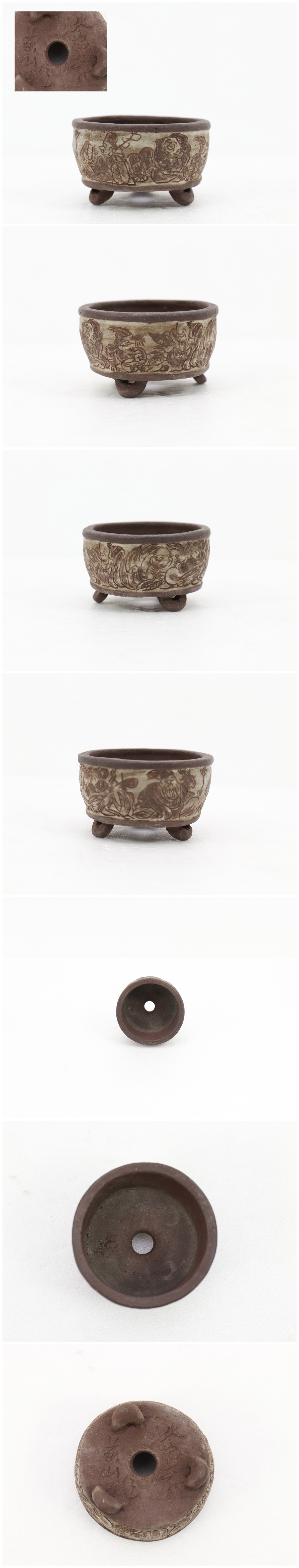 260152 「収集家のコレクター」時代物 三足 浅井茶山 作 北竜斎 人物紋 円形鉢 小品 盆栽 和鉢 豆鉢 收藏