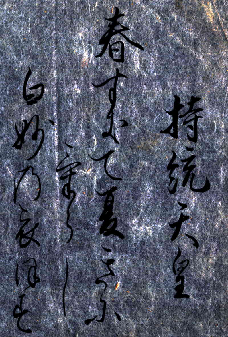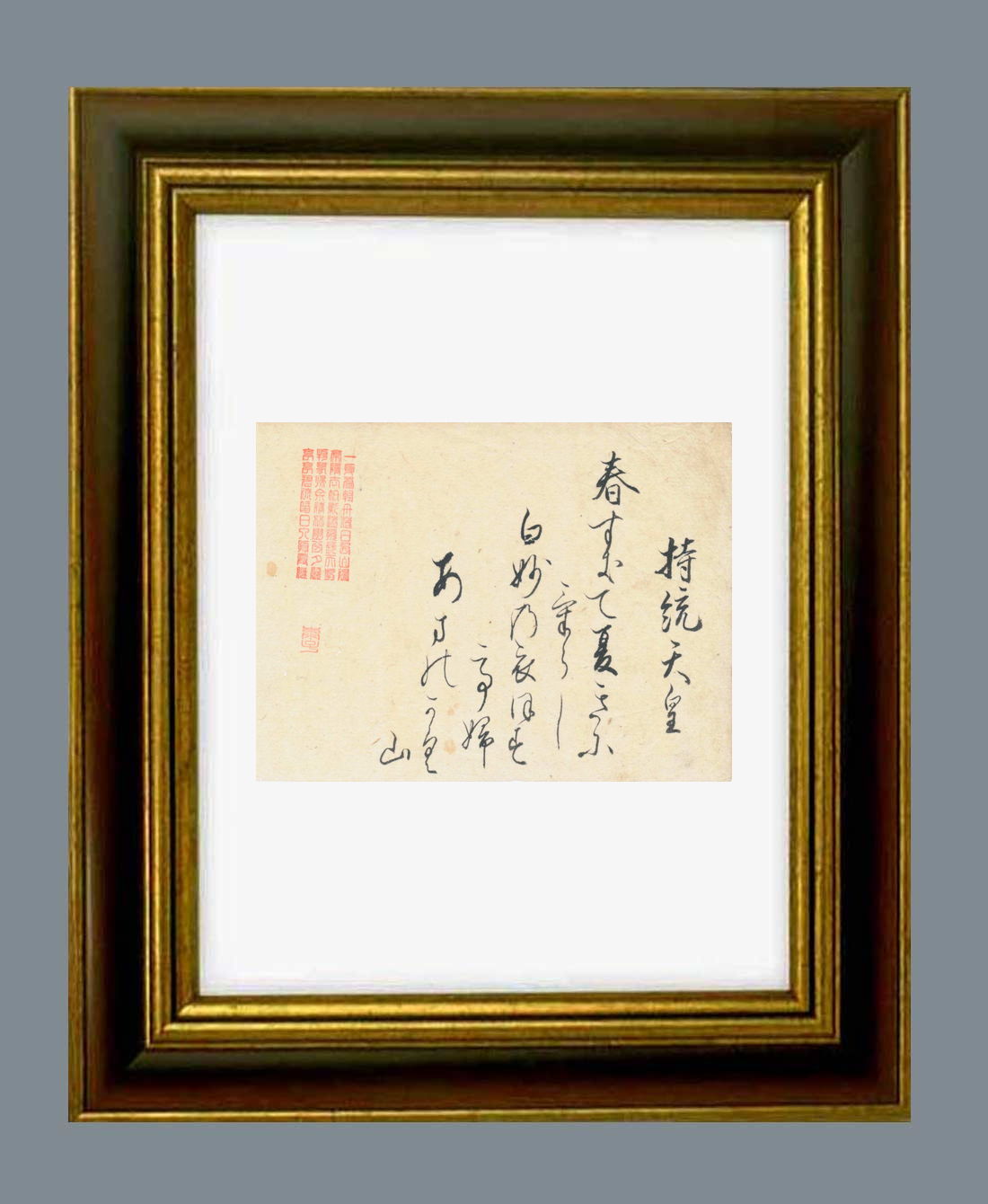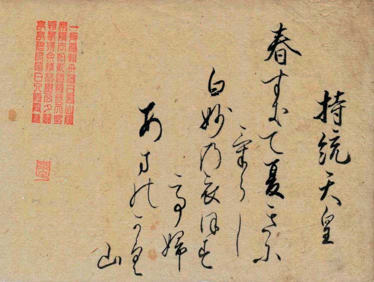 備考・「持統天皇(じとうてんのう)」は、大化一~大宝二(645-702)。天智天皇の第二皇女。母は蘇我倉山田石川麻呂のむすめ遠智娘(おちのいらつめ)。叔父の大海人皇子に嫁ぎ、草壁皇子を生む。父帝崩御の後、夫に従って吉野へ逃れ、壬申の乱に勝利した夫が即位した後は、皇后として政治を輔佐した。天武天皇崩後、皇位を継承し、引き続き律令政治の確立に努める。持統八年(694)、藤原京遷都。同十年(696)、孫の文武天皇に譲位し、史上最初の太上天皇となる。出品した「春過ぎて」の和歌は、古来「名歌」とされた。