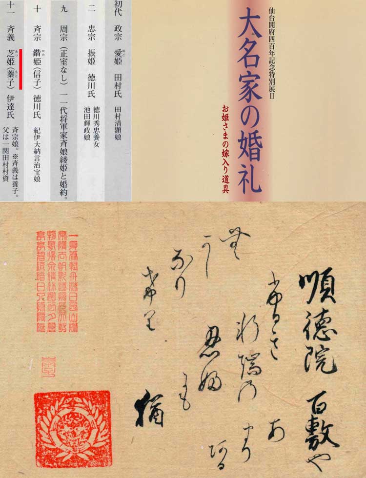 写真上右は仙台藩主(伊達家)正室一覧表の表紙。表紙の左は正室・夫人一覧の拡大写真(仙台市立博物館・刊行)
