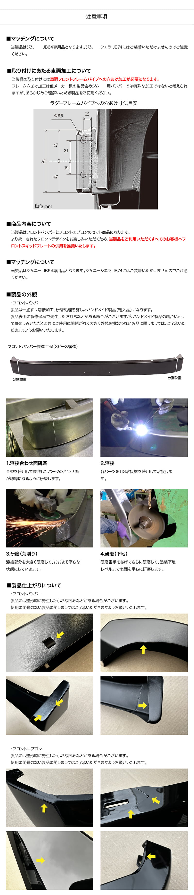 | セット内容 | フロントバンパー本体 x1/フロントエプロン x1/メインブラケット L・R x各1/ コの字ブラケット L・R x各1/ヘッドライトウォッシャースペーサー1mm 0.75mm 0.5mm x各2/ゴムキャップ x2/結束バンド土台 x1/結束バンド x1/各種取り付けボルト類一式 |