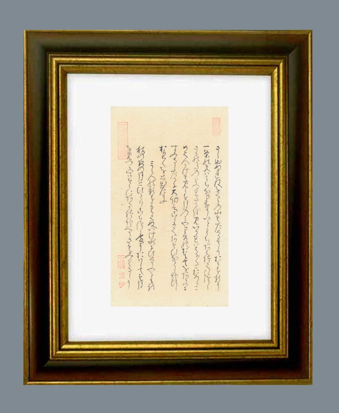 「源氏物語」自筆の大きさ タテ21.8センチ ヨコ12.8センチ。額縁の大きさは タテ37.0センチ ヨコ28.0センチです。額縁は新品です。 |