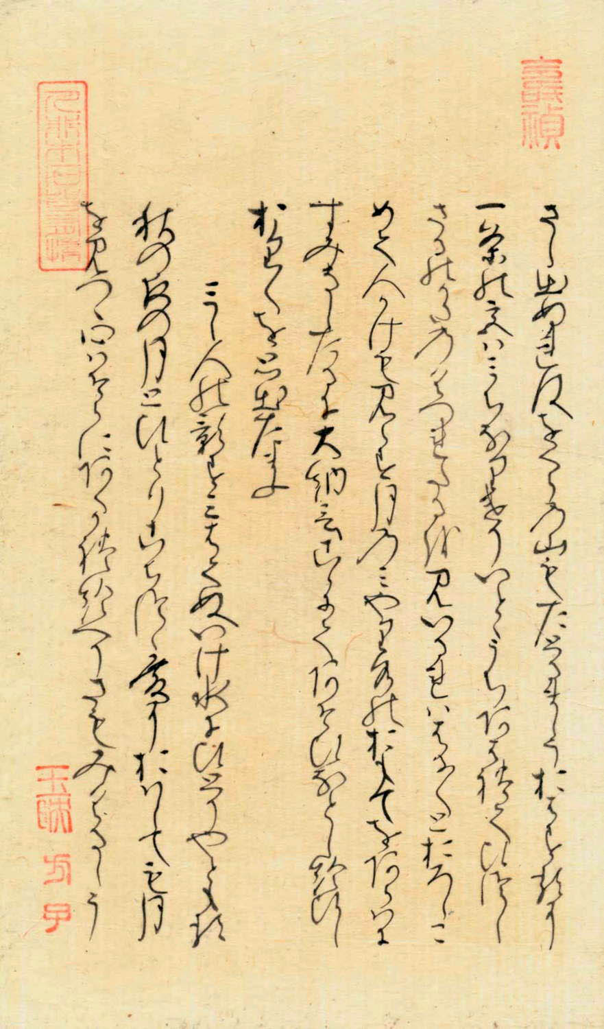 原本自筆上部に「人非木石皆有情」(人木石に非ざれば皆情けあり)の漢詩の落款が押捺されている。この漢詩は「白氏文集」の漢詩に由来するものです。源氏物語「夕霧」原本の17-Aの原本に記されております。紫式部が「夕霧」を書くに際し、「白氏文集」の漢詩を熟読したうえで「源氏物語」の「夕霧の巻」を書いていることがわかります。この原詩の言葉の引用は、「蜻蛉の巻」に用いられていることで広くしられている。紫式部がこの原詩に親しんでいたと推定されている。