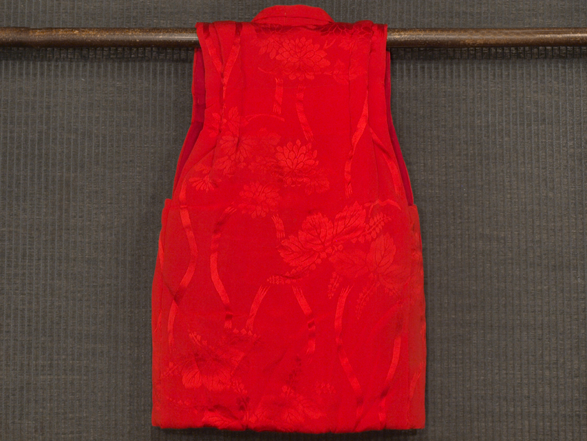 【子ども】やぶれ立涌に桐菊文 深緋色無地 紋縮緬 袖なし羽織 ちゃんちゃんこ 綿入れ アンティーク 丈52 TAME04002風楽 |