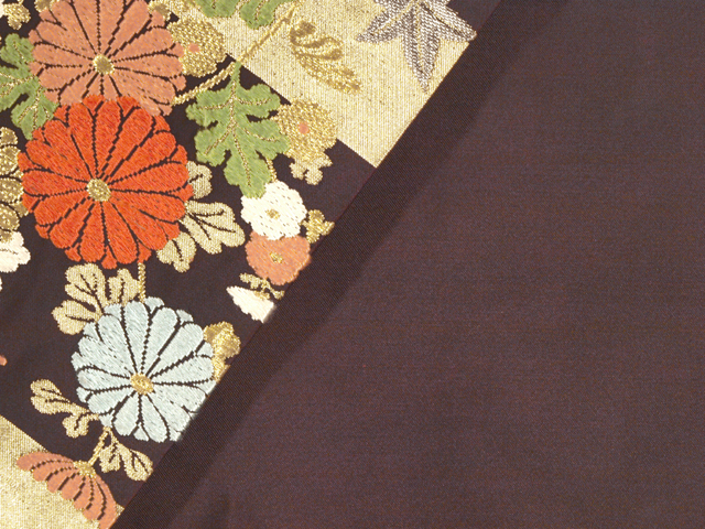 沈んだ紫鳶(むらさきとび)色の地に金銀の箔糸で霞(かすみ)と楓(かえで)の竜田川の地紋、菊の文様が織り込まれている、西陣織の名古屋帯です。 格調のある雅びさが感じられるお色目と意匠で、完成度の高さが感じられます。文様に配された色糸に立体感があり、文様に深みを与えています。 ユーズド品で、箔糸にユーズド品なりのごくこまかな凹みがちらほらとあるほか、画像のとおり、たれの右下角に直径約 5mm の変色が 1 か所あります。また、たれ先や胴回りのへり、胴回りの内側の柄抜き部分など、全体のところどころにごくうっすらとした褪色がちらほらとありますが、あまり目にはつきません。そのほかに目につく大きなしみやよごれ、褪色などのダメージはないので、気にされない方であればご着用は可能と思われますが、状態ランク=「D」のご着用対象外、リメイク素材用とさせていただきます。 |