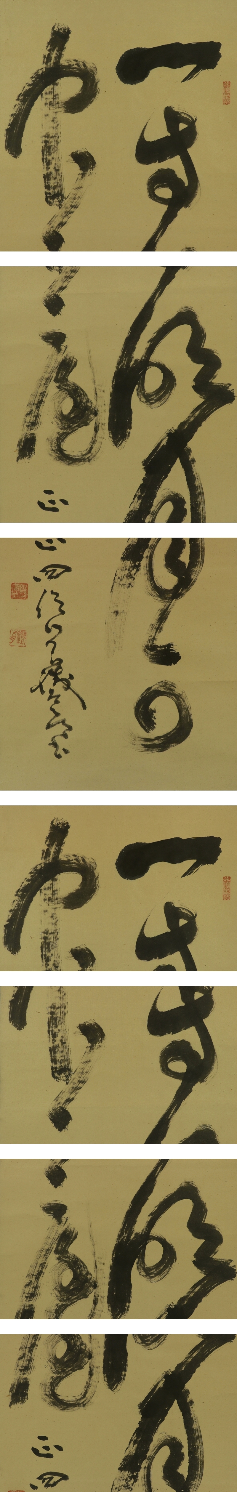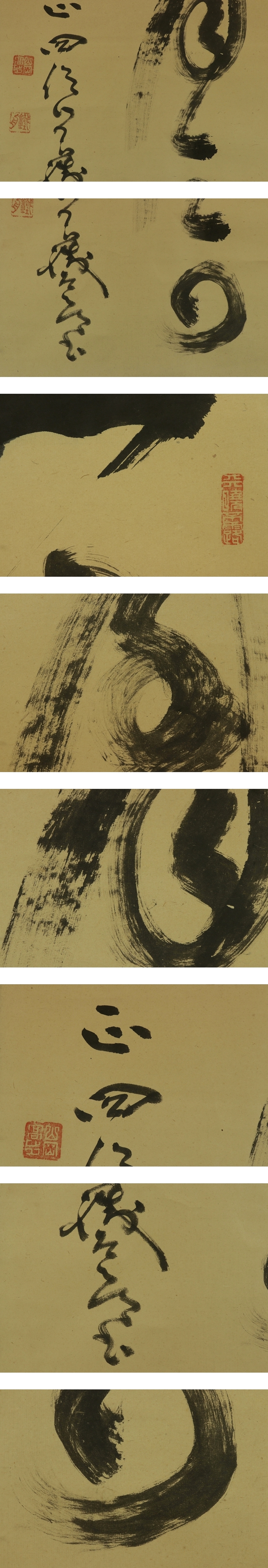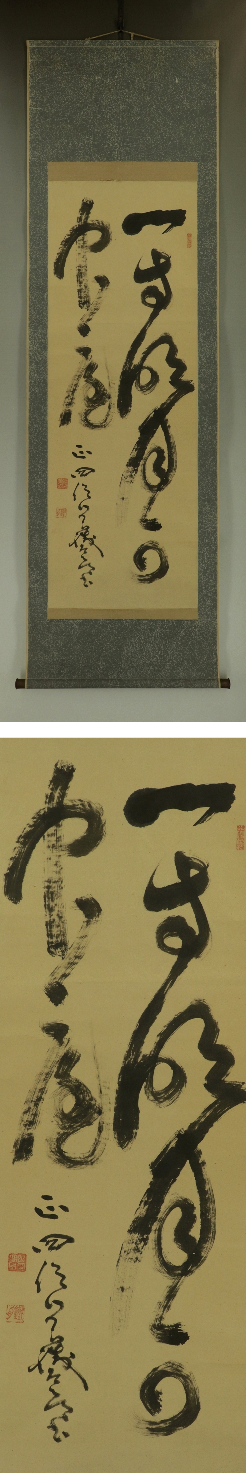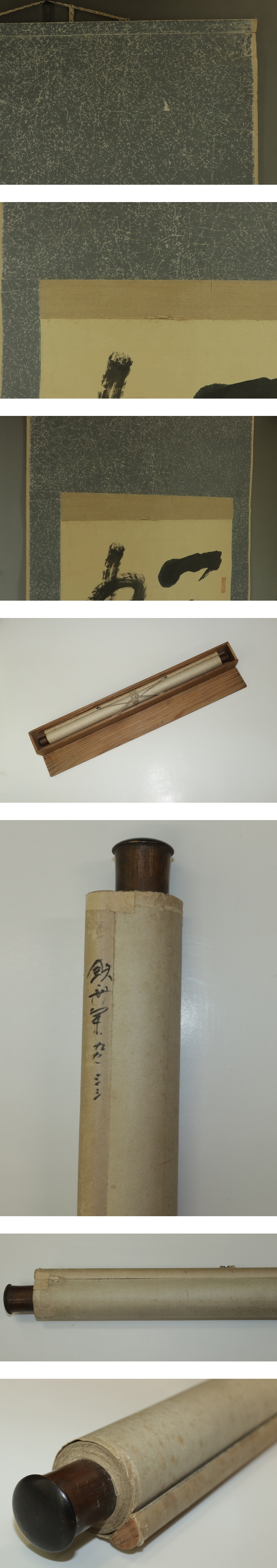 山岡鉄舟 やまおか-てっしゅう(1836-1888) 幕末-明治時代の剣術家,官僚。 天保7年6月10日生まれ。山岡静山の妹と結婚,静山の跡を継ぐ。 剣を千葉周作の門に学び,幕府講武所で教える。 戊辰戦争では勝海舟の使者として西郷隆盛に会い,江戸開城の為の勝-西郷会談の道を開く。 維新後は静岡藩権大参事,茨城県参事,明治天皇の侍従などを歴任。 明治13年一刀正伝無刀流をたてる。海舟,高橋泥舟と共に幕末三舟と称された。 明治21年7月19日死去。53歳。江戸出身。 本姓は小野。名は高歩。字は曠野,猛虎。通称は鉄太郎。別号に一楽斎。 本紙は、染み、汚れ、強い折れ、皺があります。 表装は、染み、汚れ、折れ、皺、虫食い、破れ、ほつれ、剥れがあります。 【サイズ】 作品 横約46cm×縦約133cm 表装 横約59.5cm×縦約201cm |