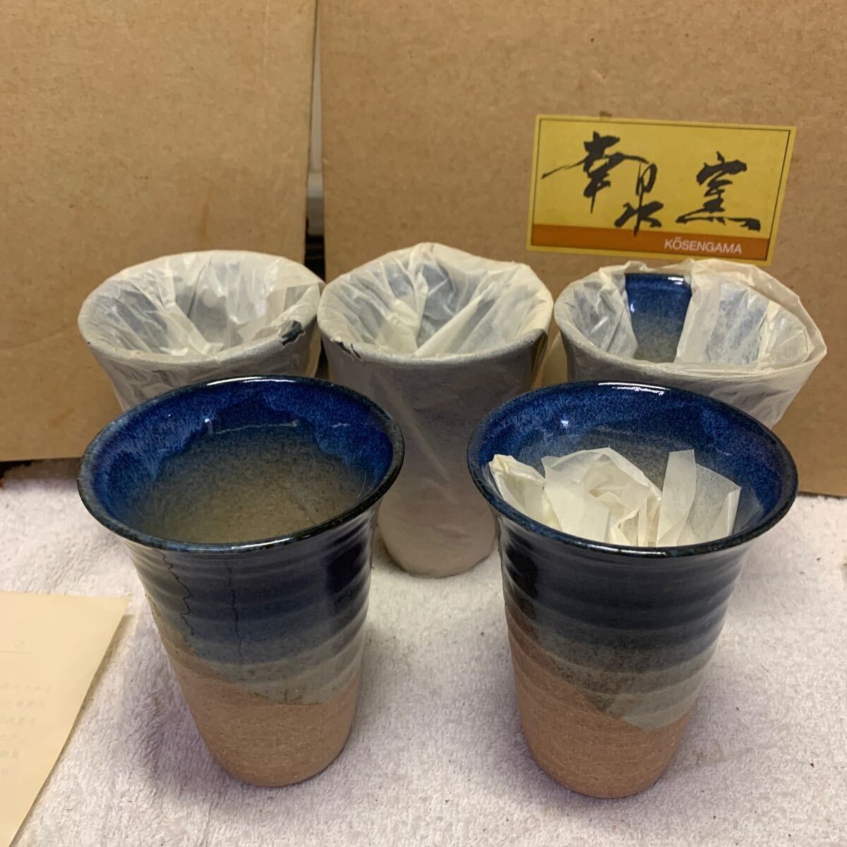 高さ約12センチ、直径約8センチ湯のみ5個とコースター5枚になります。ノークレームノーリターンでお願いします。