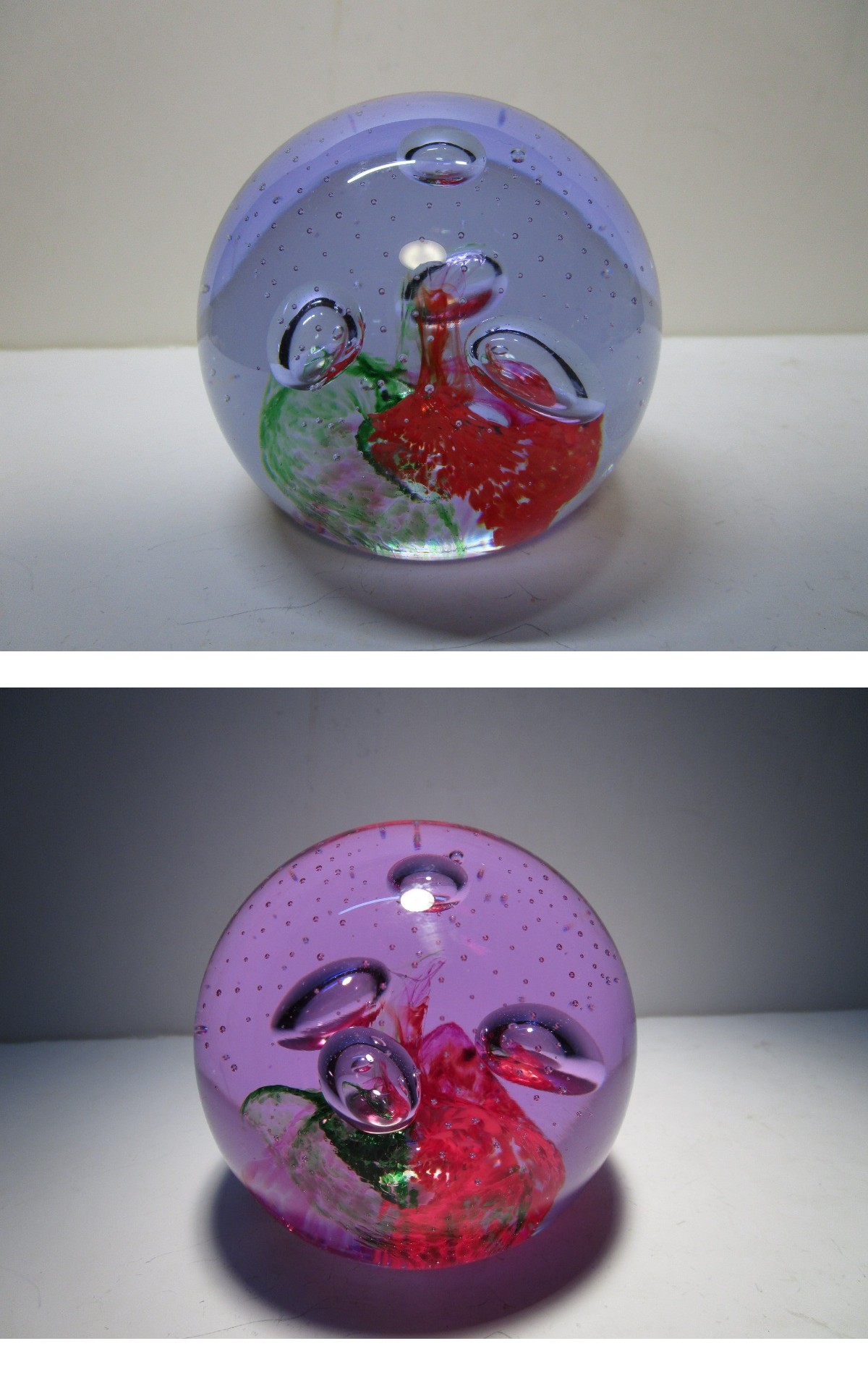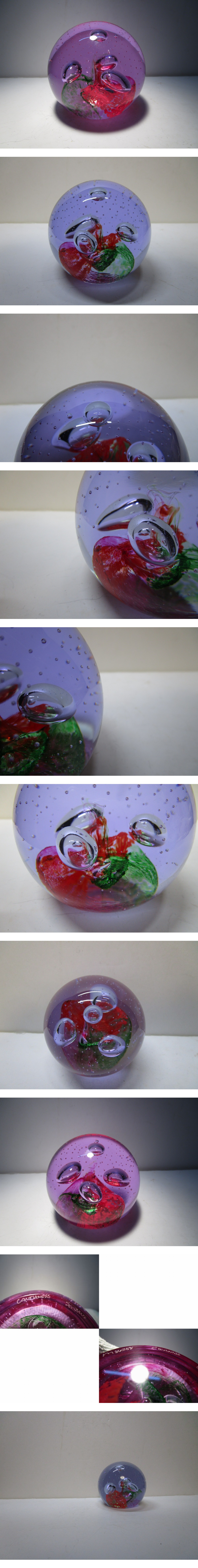 Escapade(突飛な行為)という名の作品。作品名とデザインの関連はさておき、オーソドックスな球型のフォルムの底面の赤とグリーンの渦巻き模様はバラの花弁にも見え、その周りを浮遊する大き目のコントロールバブルによる4つの気泡、上部に広がる細かな気泡の羅列が作品に幻想的な趣きを与えています。ケイスネスのペーパーウエイトらしい有機的で柔らかなデザインが魅力的な良品です。ネオジウムガラスという特殊なガラスを用いて作られているので、蛍光灯のもとでは全体的にペールブルー、自然光や白熱灯のもとではピンクがかったパープルに色が変化してみえるのも魅力の一つです。