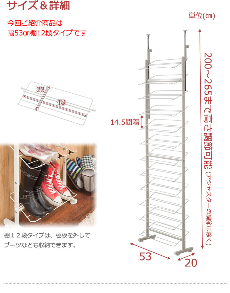 ■商品サイズ/本体:(約)幅53×奥行22.5×高さ200~265cm、脚部アジャスター調節範囲/(約)1cm、棚間隔/(約)14.5cm
