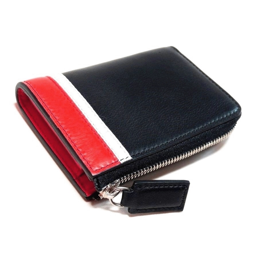 | 素材、カラー | 表地はカーフレザー100%、カラーはブラック/ホワイト/レッドのトリコロール、内側にヒートエンボス加工によるロゴ、裏地はレーヨン100%、銀色の金具 |