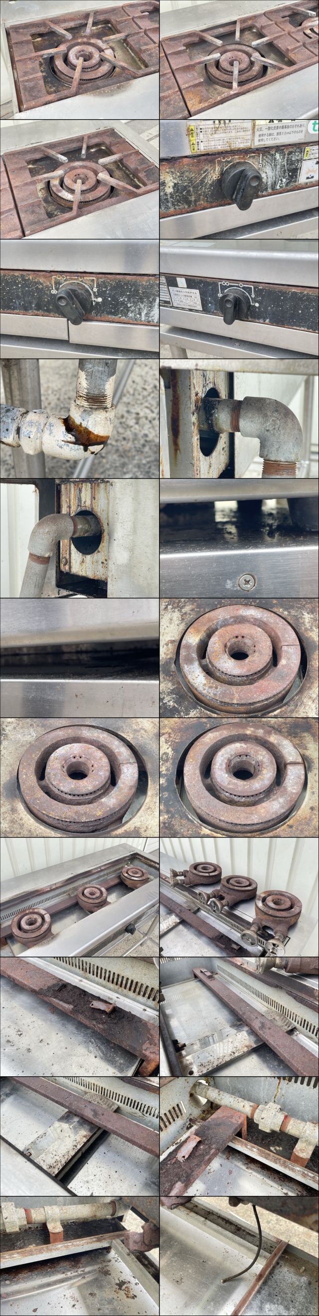 状態チェック担当者のコメント 全体的にキズ汚れが多くダメージがあります。 サビがひどく劣化が激しいです。 真ん中と右側のバーナーの受けが劣化により欠損しています。 取り切れない油汚れが多いです。 動作 動作ランク G ジャンク品