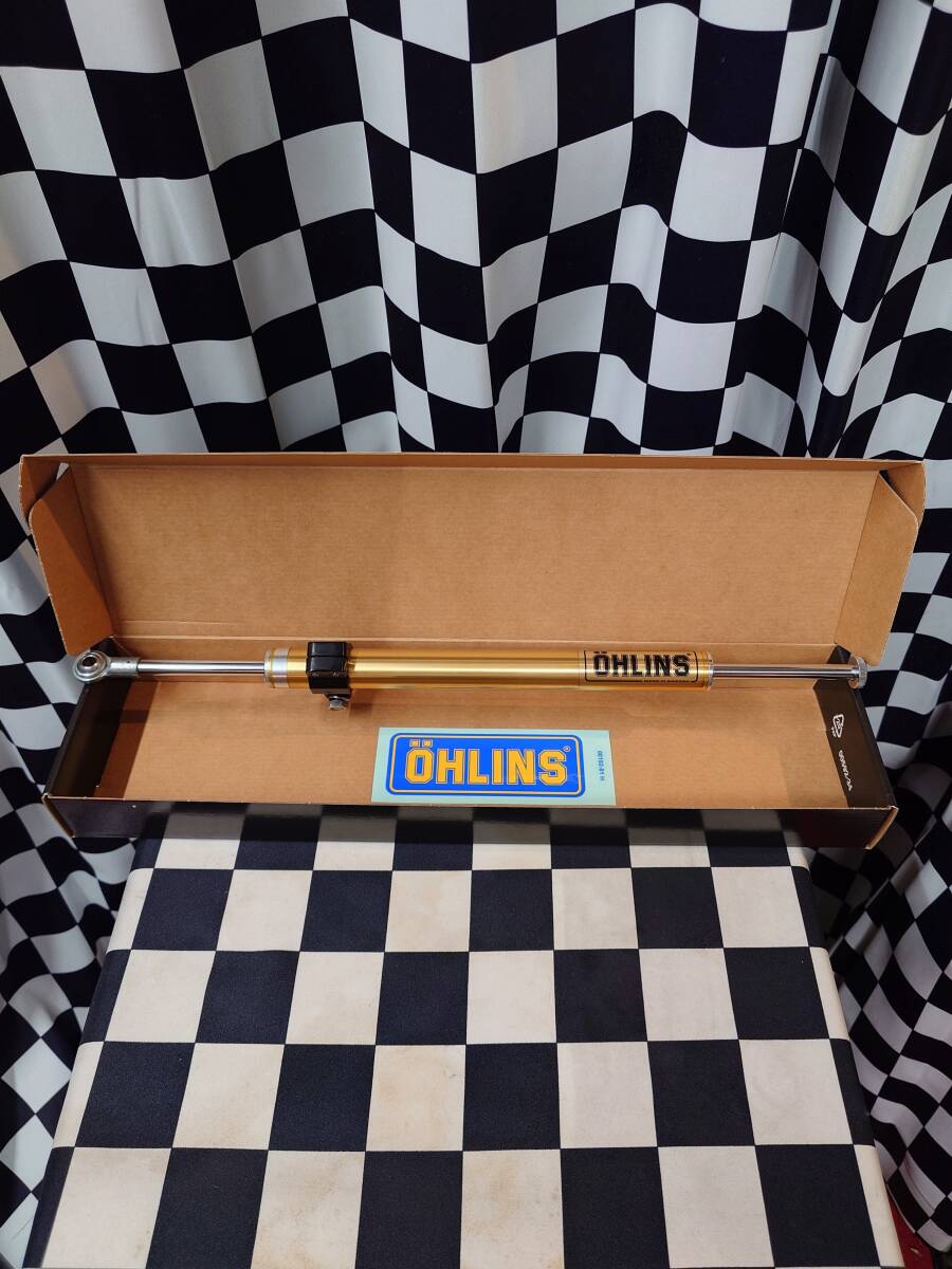 私は元々、ハーレーダビッドソンにデイトナ製のステアリングダンパーを装着して使っていたのですが、容量不足と見た目の迫力の無さ(とても細い単なる銀色の棒である所)を感じていた為、このステアリングダンパーKITの在庫残りをネットと電話を駆使して探し回り、わざわざ地方のバイクパーツ量販店(ライコ・ナップス系)まで高速道路を車で飛ばし、閉店間際で埃をかぶった新品を購入し、純正オーリンズステッカーを買い足して貼り替えて流用で使っておりました。