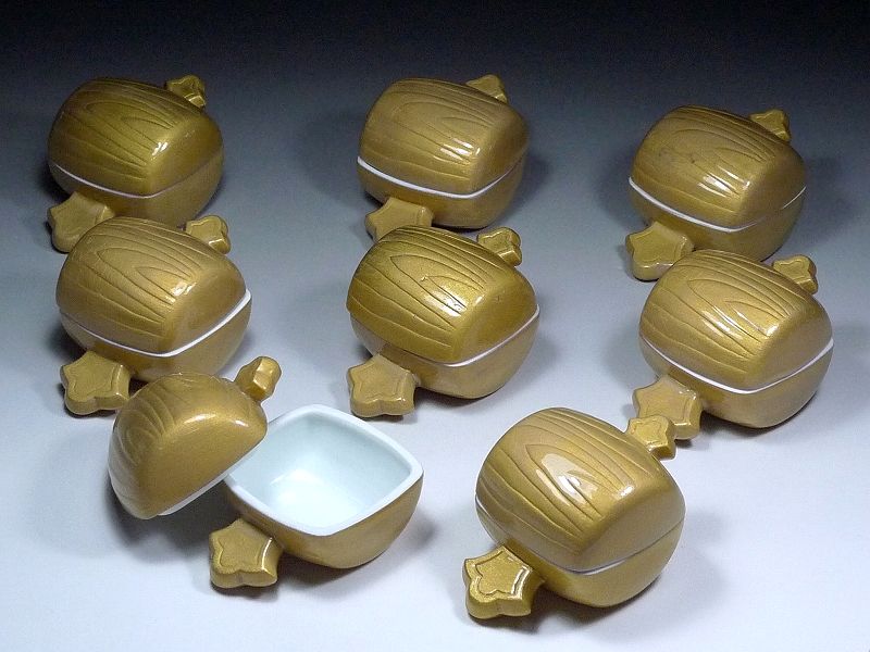 60WS51★【高級料亭にて使用】在銘品 打ち出の小槌形 蓋付小鉢 8点 蓋物 割烹 日本料理 和食 和食器 收藏