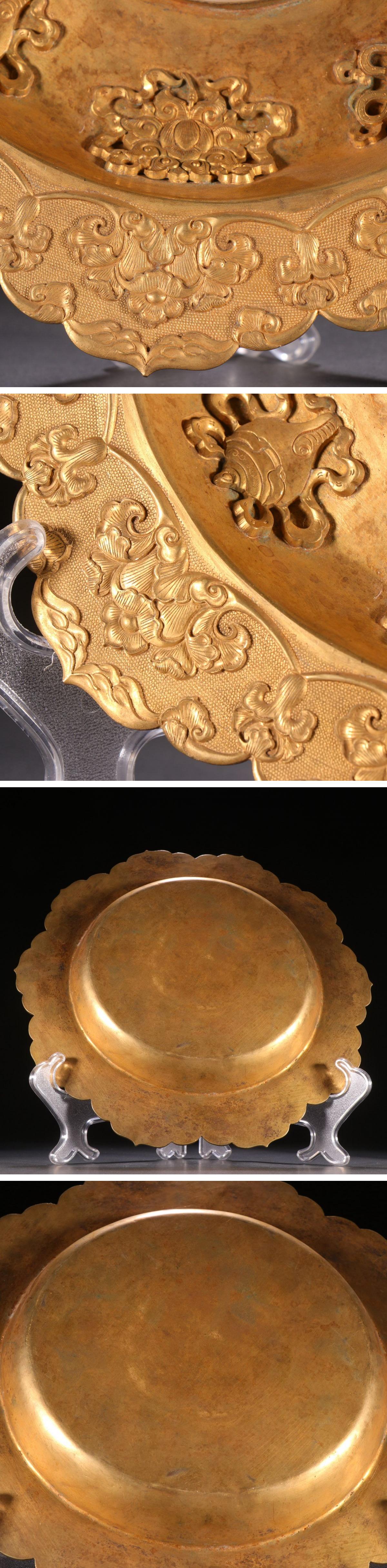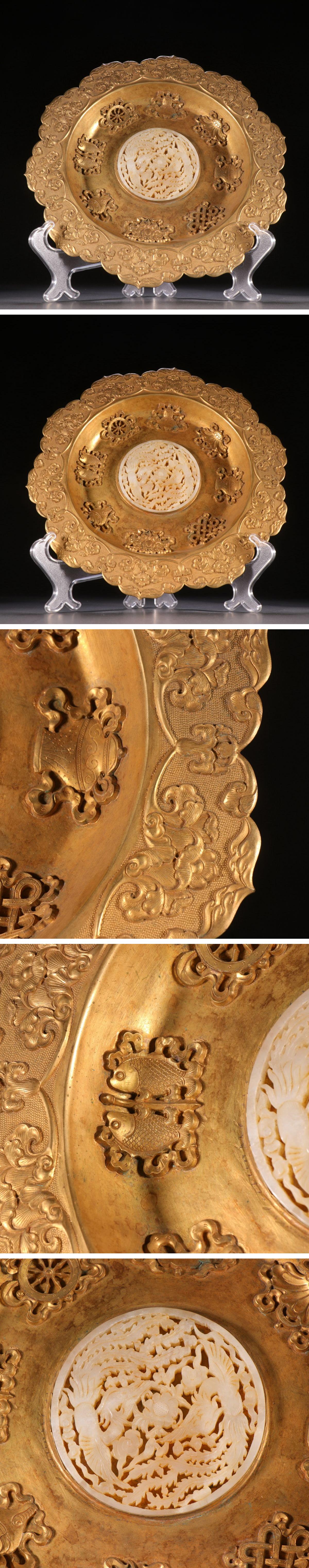 【清】某有名オークション購入 清時代 銅金象嵌和田玉 八寶紋賞盤 材質保証 古置物 古擺件 古美術 時代コレクション7L9-IR1