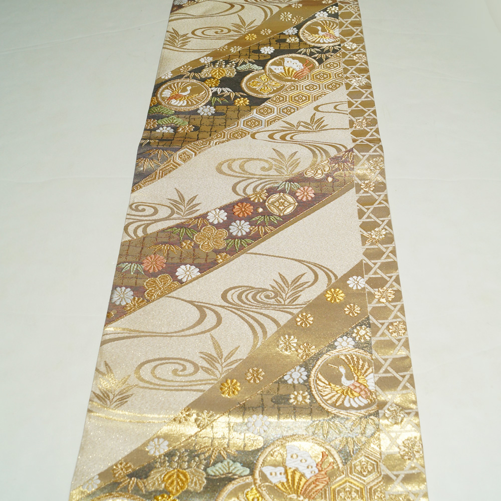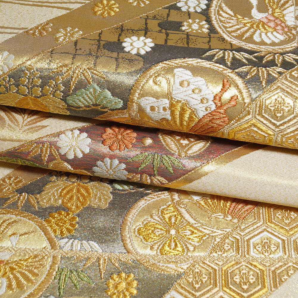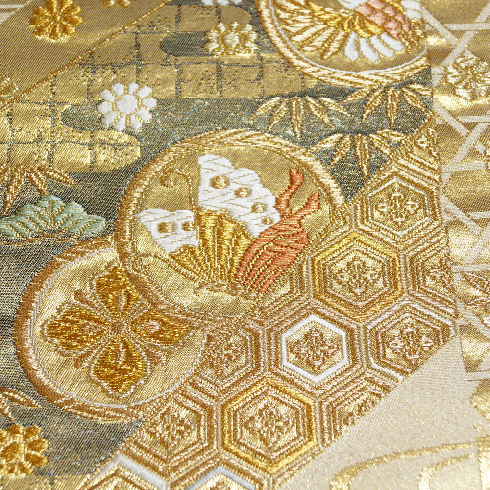 | 商品 説明 | 金・生成り色系の綴れ地に短冊に丸紋、桜や松、亀甲花菱、流水などの模様が金糸・色糸にて織られた袋帯です。本金箔や金糸をふんだんに使用し、色糸は唐織にて施された振袖にもご利用いただける帯です。 |