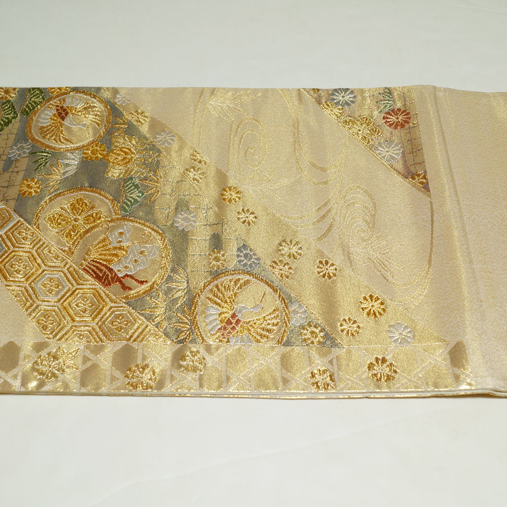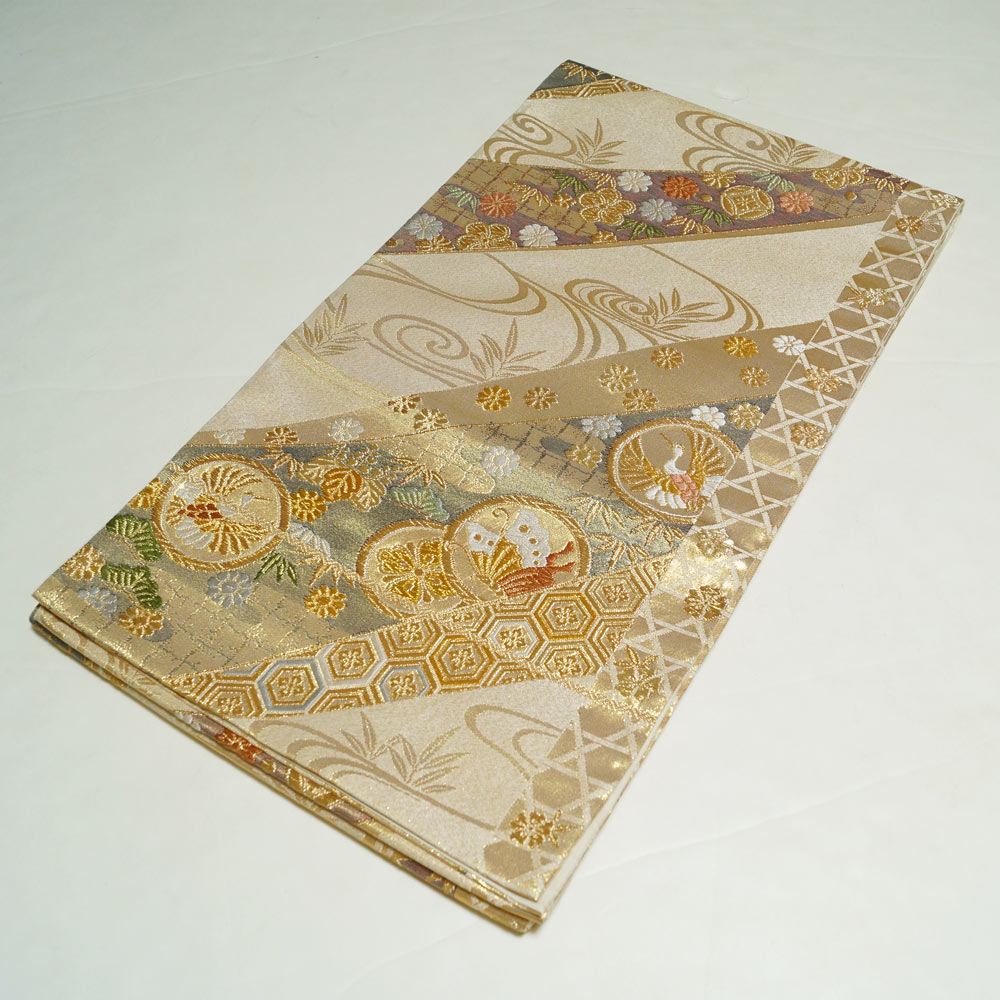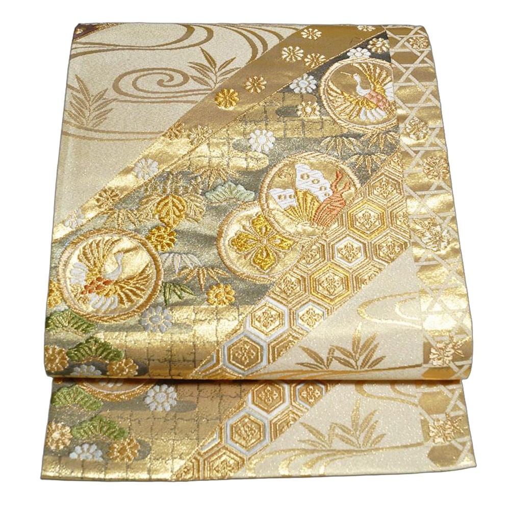 袋帯 未使用品 短冊に丸紋・吉祥模様 綴れ 唐織 金糸 六通柄 金・生成り色系 金系 中古 リサイクル着物 帯 フォーマル 着物 きもの天陽 收藏