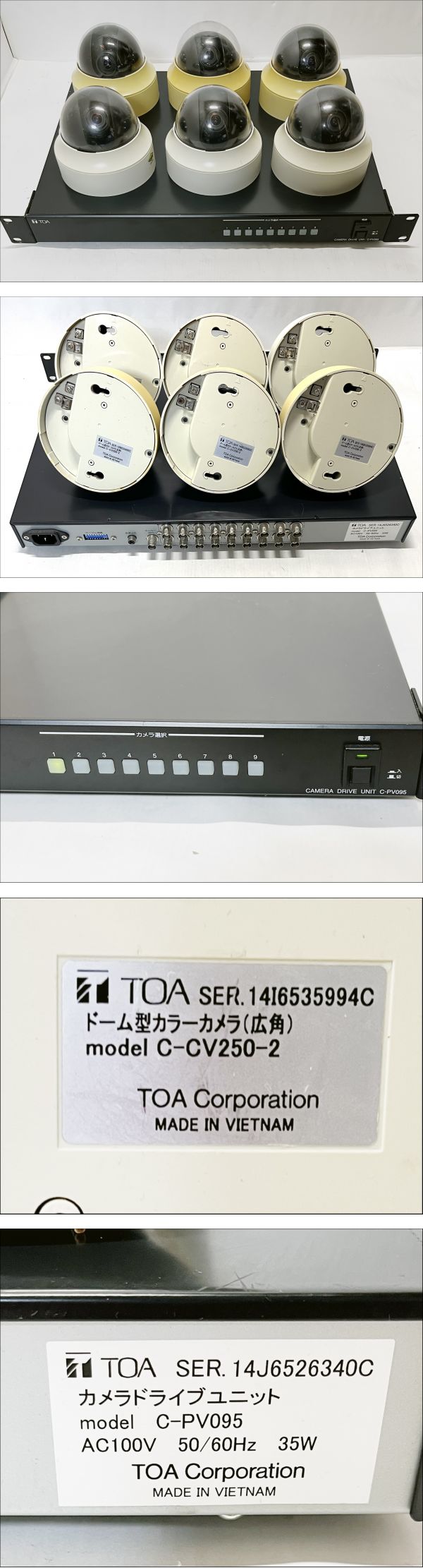 | 【①動作未確認・現状品】 TOA ドーム型カラーカメラ C-CV250-2 6台 カメラドライブユニット C-PV095 セット | ||