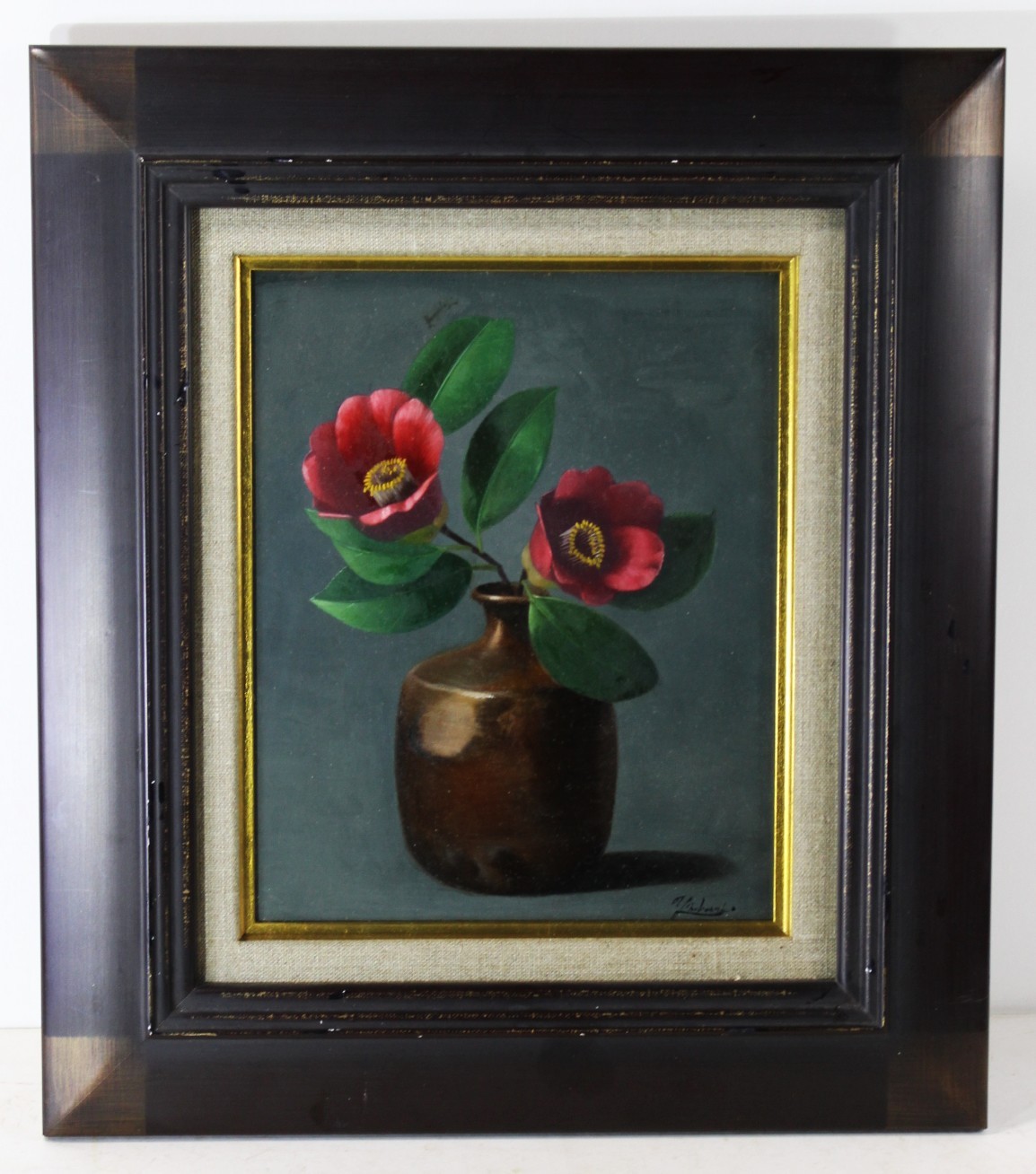 《真作》★中西 芳弘【椿】油彩 3号.額装*無所属*国際亜細亜現代美術展入選*海外選抜展*個展多数*武蔵野美大*備前壺に椿*大分*[桃] 收藏