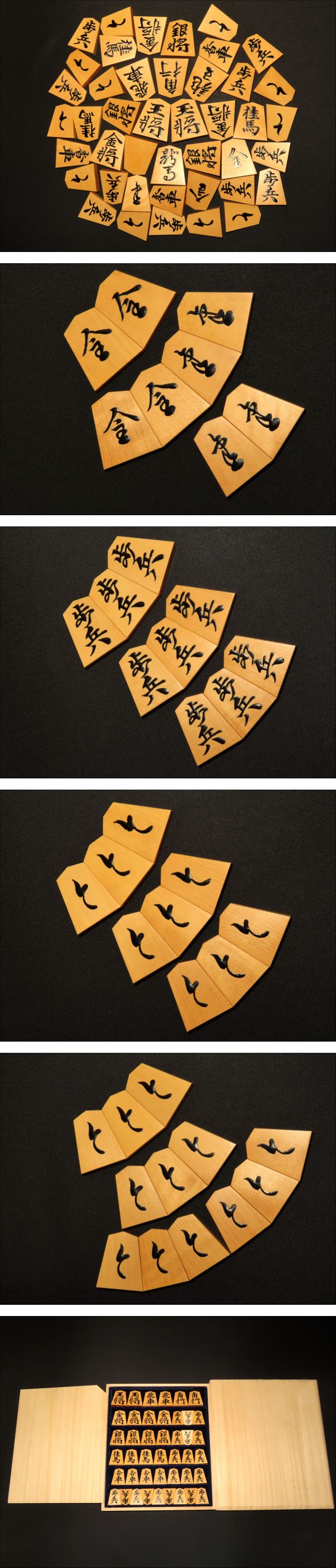 木地は御蔵島黄楊斑入上柾目。ご覧の通り非常に味の良い木地です。全ての駒の表裏をUPしてございます。是非ご覧下さい。