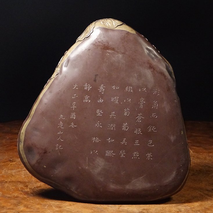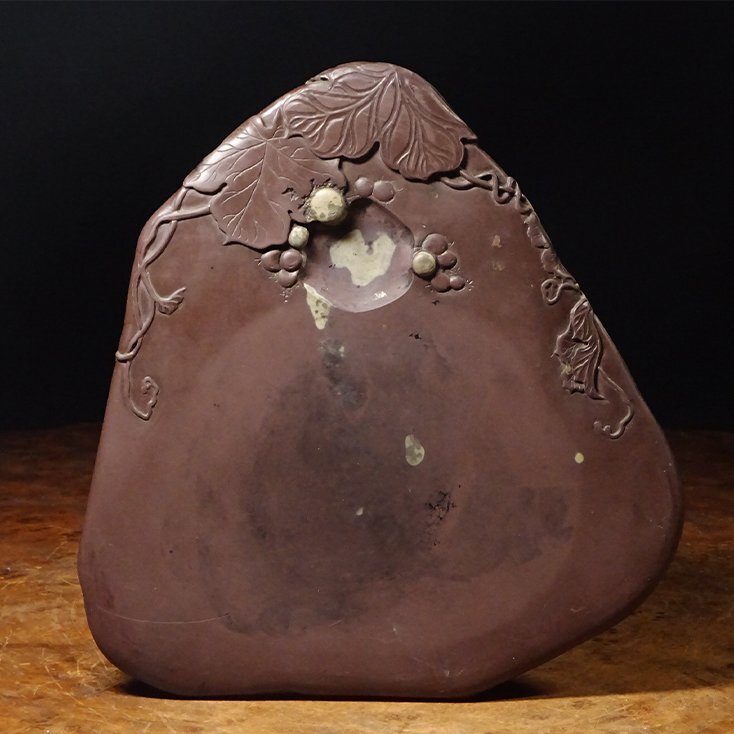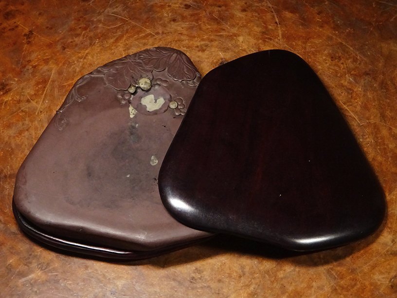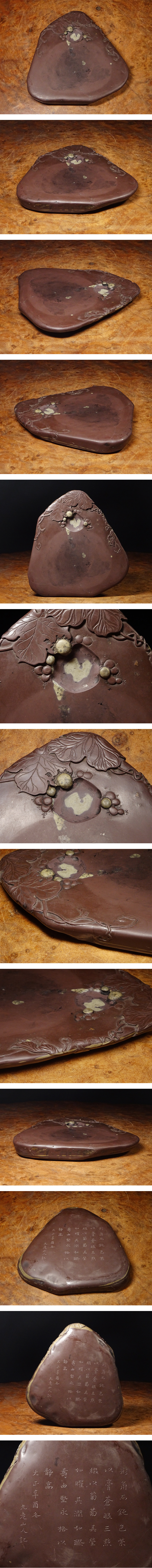 慶應◆中華民国期 文房四宝 葡萄紋端渓硯 「九老山人」漢詩彫 唐木台蓋 旧蔵箱 書道具 中国美術老坑文房具 收藏