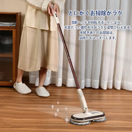 【高い操作性でラクラクお掃除】回転モップのヘッドの角度が自由自在に動かせます。汚れの溜まりやすいお部屋の隅もしっかりキレイに。充電式なのでコードレス操作ができるため、コードに邪魔されず、どこでも自由に掃除ができます 。自立するから収納しやすく、お掃除中もサッと置いておける。また、回転モップ用台座を付属されて、湿っていたモップパッドを床に直接接触するのを避けて、カビが生えるのを防止することができます。
