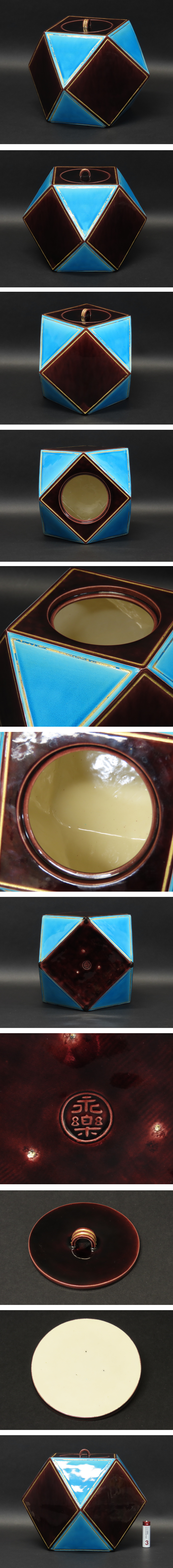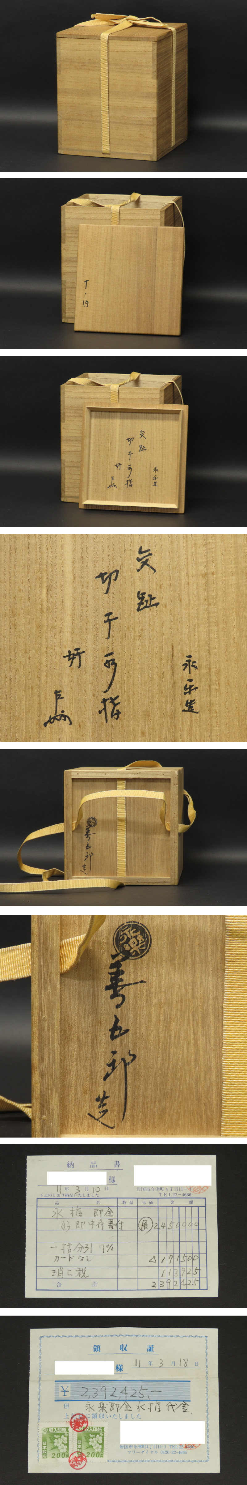 【月】【骨董 茶道具23】十六代 永楽善五郎(即全) 真作保証 青交趾 切子水指 表千家十三代家元 即中斎書付 共箱(購入金額239万円 領収書) 收藏