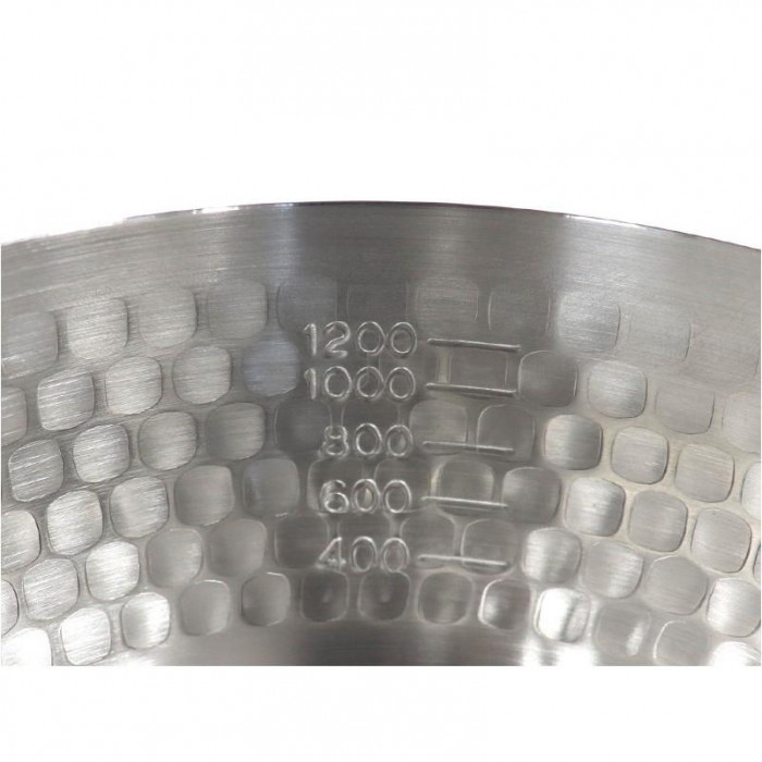 | 本体外側は槌目加工が施されており、表面積が広く熱効率が高くなっています。蓋はガラス窓タイプのため、調理中の様子が確認できます。本体の両側に注ぎ口があるため利き手を選ばずお使いいただけます。 |