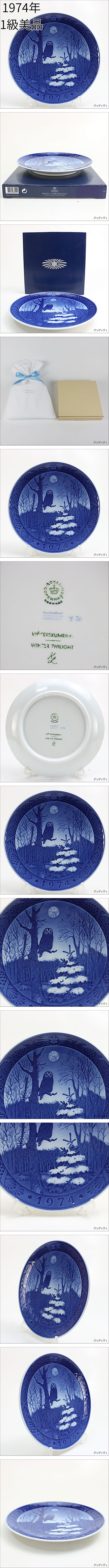 | ロイヤルコペンハーゲンの1974年製イヤープレート 「冬の黄昏」の出品です。 ・ロイヤルコペンハーゲンのイヤープレートは 1908年の初年度版イヤープレート 「マドンナとこども」以来、 第一次、第二次世界大戦をものりこえ、 100年以上にわたり製作され続けております。 世界の人々に愛され、美しく、親しまれるモチーフが描かれ、 その年とともに記憶に残るプレートになっています。 ・1974年のイヤープレートは黄昏時の冬景色を描いています。 前側には、夜行性動物の梟が枝にとまり、 後側には満月が輝いております。 冬の北欧に生活している誰もが シェリーの西風に寄せる歌”冬来たりなば、春遠からじ” で歌われている気持ちが理解できると思います。 カジ ランゲはこのモチーフの中で、 自然が休みに入り、少数の動物しか 活動していない安らかな静けさを表現するとともに、 冷たい冬の黄昏が、春の暖かさの光にだんだん変わっていく 期待を持たせる季節の美しさを表現しています。 ・またプレートは、1枚づつ手書きで描かれているため、 微妙に違いがあります。 それぞれが世界でたった1枚の貴重品でもあります。 ぜひこの1枚をお楽しみください。 ・本物保証 ・詳細: サイズ: 直径 約18cm 高さ 約2cm 重さ: 0.3Kg 色: コバルトブルー、白 材質: 陶磁器 等級: 1級品 ロイヤルコペンハーゲンの波マークが スクラッチで削られていません。 原産国: デンマーク デザイナー: Kaj Lange 状態:かけ、割れ、ヒビはありません。 若干のスレがありますが、釉薬の光沢も十分にありきれいです。 掲載写真のギフトバックと陶磁器用パッケージに入れてお届けいたします。 小冊子付きです。 ・ビンテージ品ですので、ご理解の上ご入札をお願いいたします。 素晴らしさを ご堪能いただき、この機会にぜひ応札いただきますよう お願いいたします。 ・返品について: 商品がご希望にそぐわなく返品ご希望の場合は、 商品到着より1週間以内に取引ナビにてご連絡ください。 誠意をもって対応させていただきたいと思います。 なお返品に際しご返却の送料、 手数料(落札金額の10%)については、 入札者様のご負担をお願いいたします。 ・ご購入にさいして: 食品衛生法上の点から、ビンテージ品、装飾品として お楽しみいただきますようお願いいたします。 写真中のスタンドは商品に含まれておりませんので、 ご了解お願いいたします。 2511-117 | |||