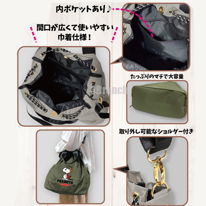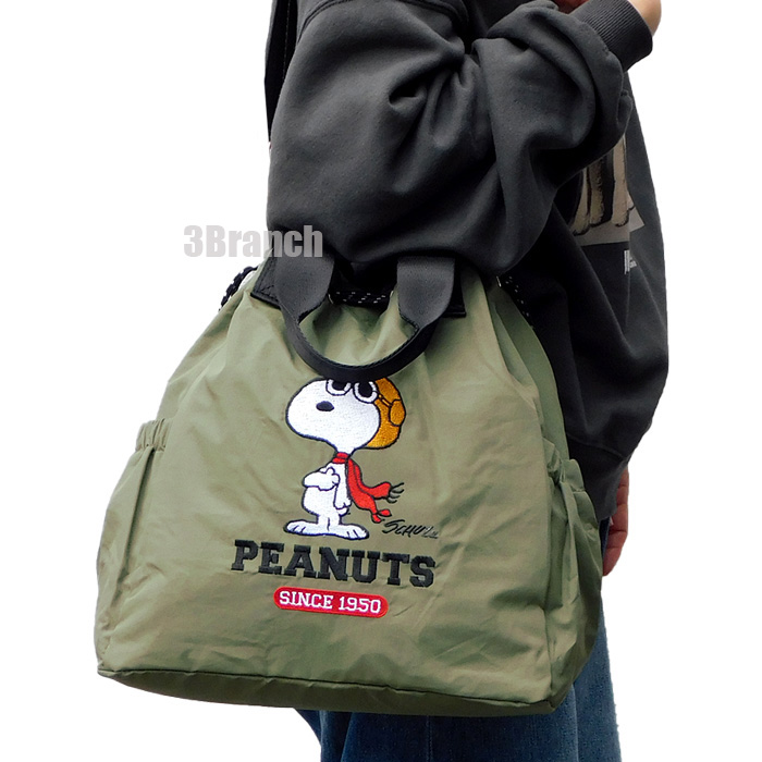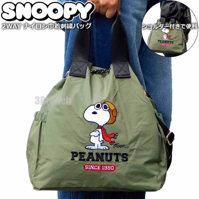 スヌーピー 75周年 2WAY ナイロン 刺繍 巾着バッグ 3 トートバッグ レディース ショルダーバッグ ドロストバッグ ドローストリング カーキ 收藏