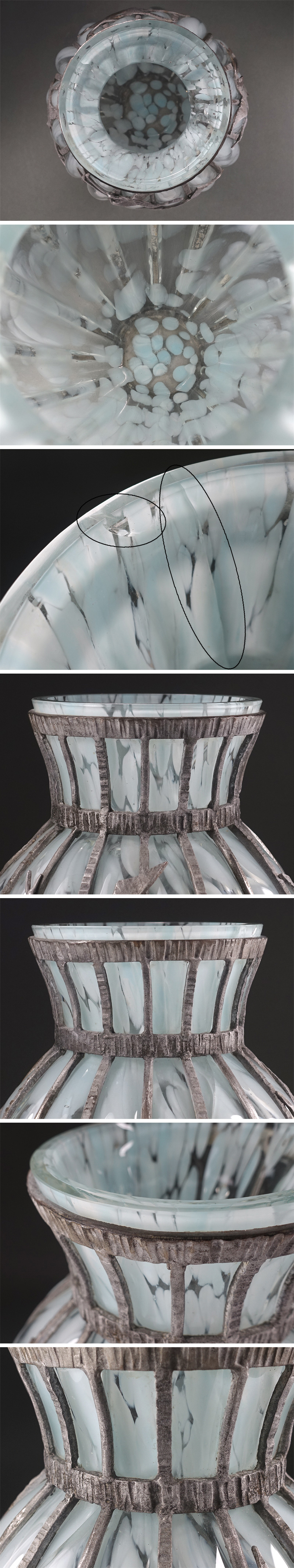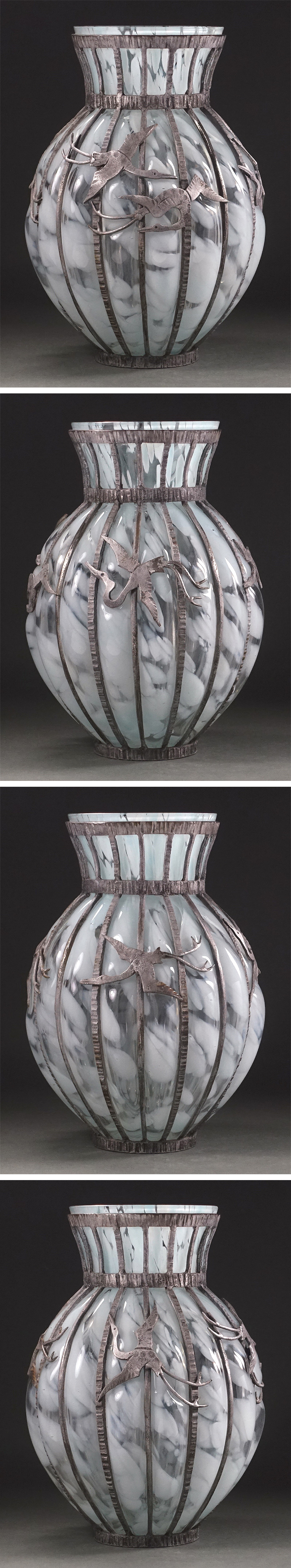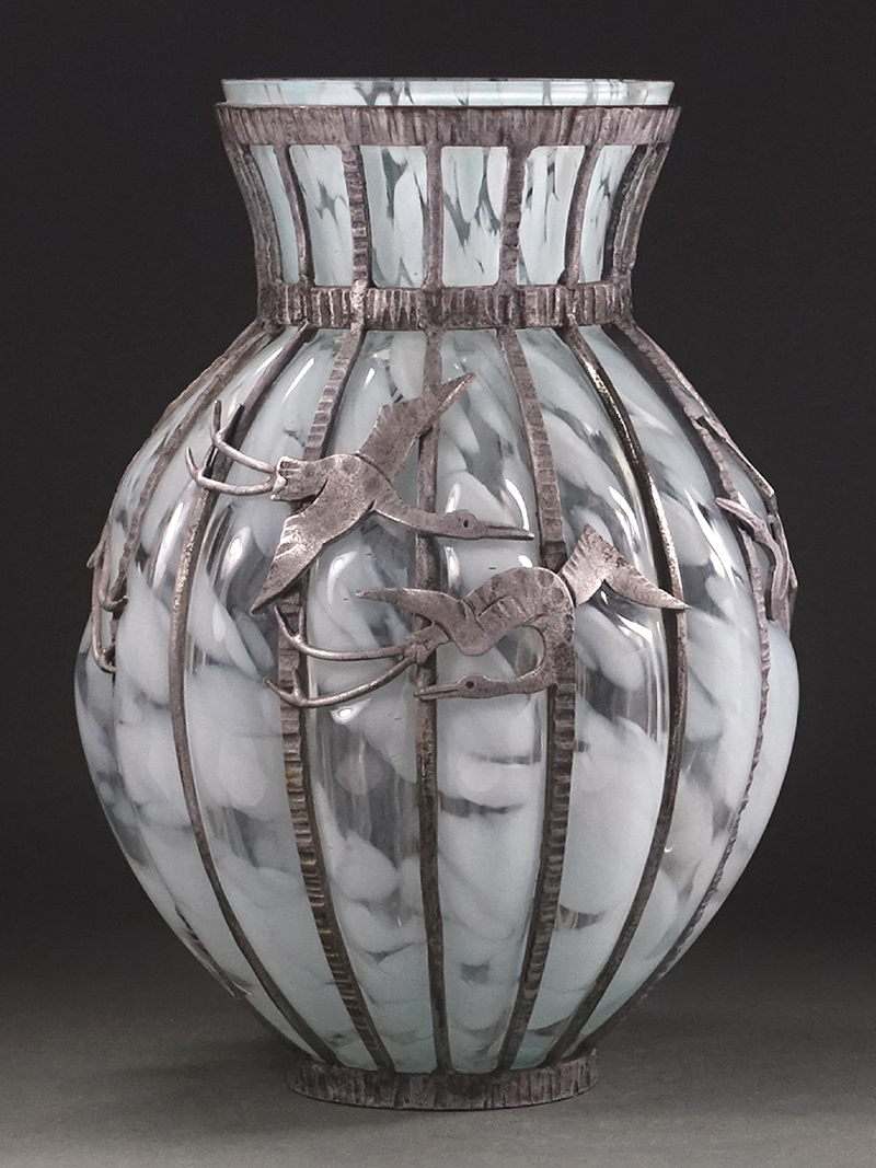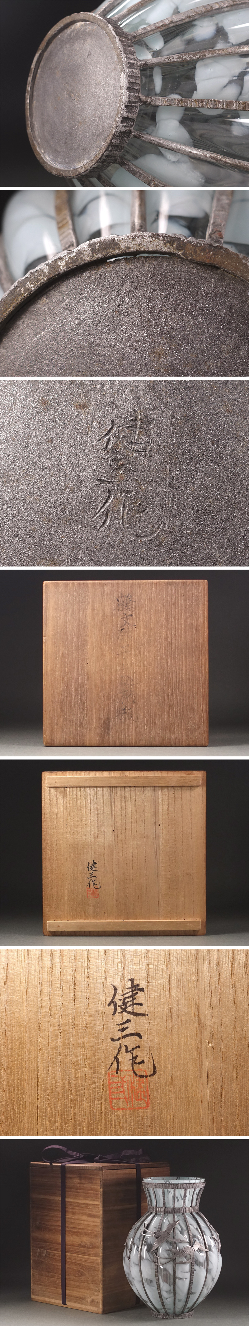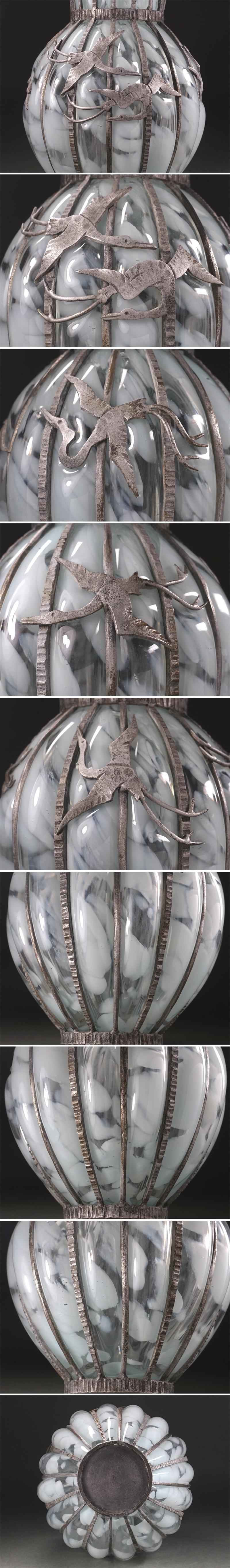 ∇花∇【宮代健三】作 鋳鉄吹き込みガラス 鶴文硝子吹込花瓶 高さ27.5cm 共箱付 鉄×ガラスの重厚な造形美 收藏