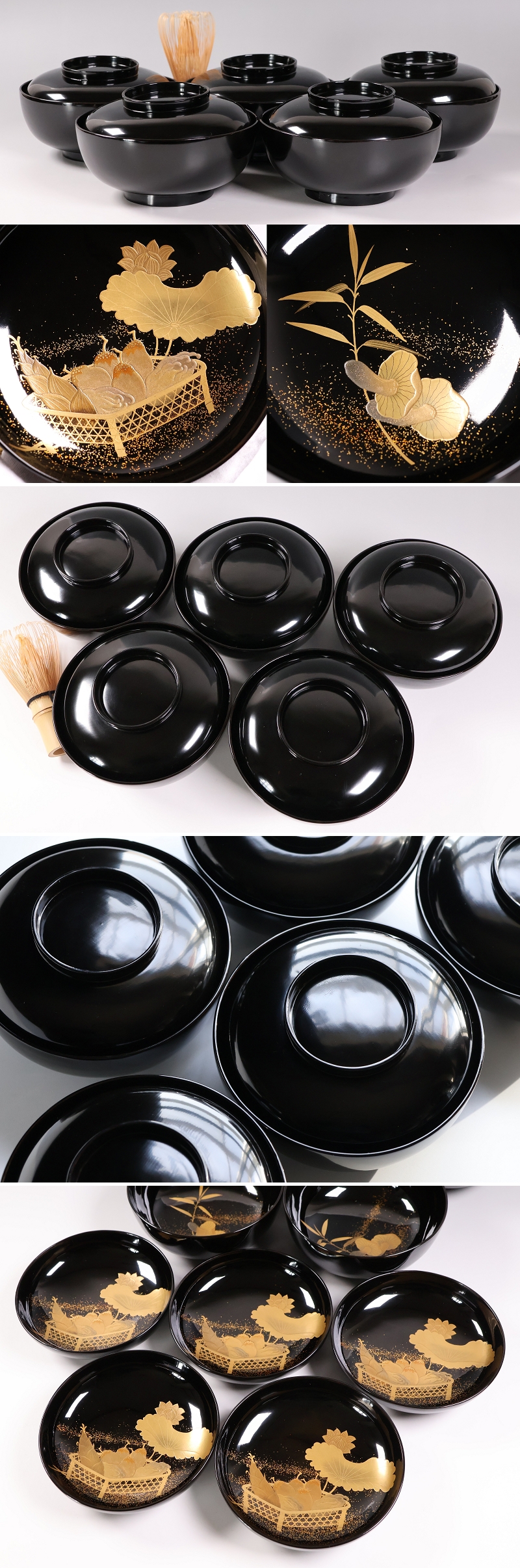 【CM413】天然木漆塗 加賀蒔絵 蓮と野菜金蒔絵 黒煮物椀 五客 木製漆器 昭和期 梨地 / (検) 輪島 加賀 京都 茶懐石 会席 漆芸 伝統工芸品 收藏