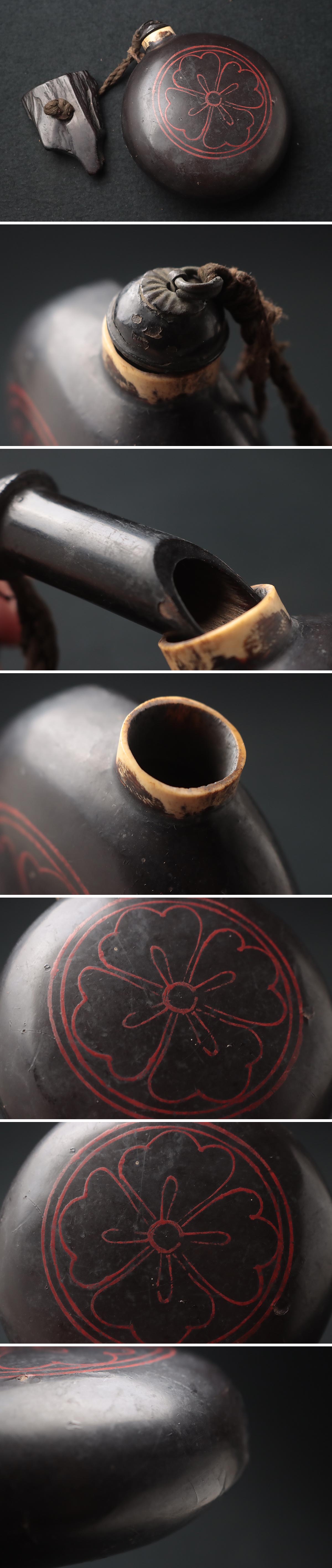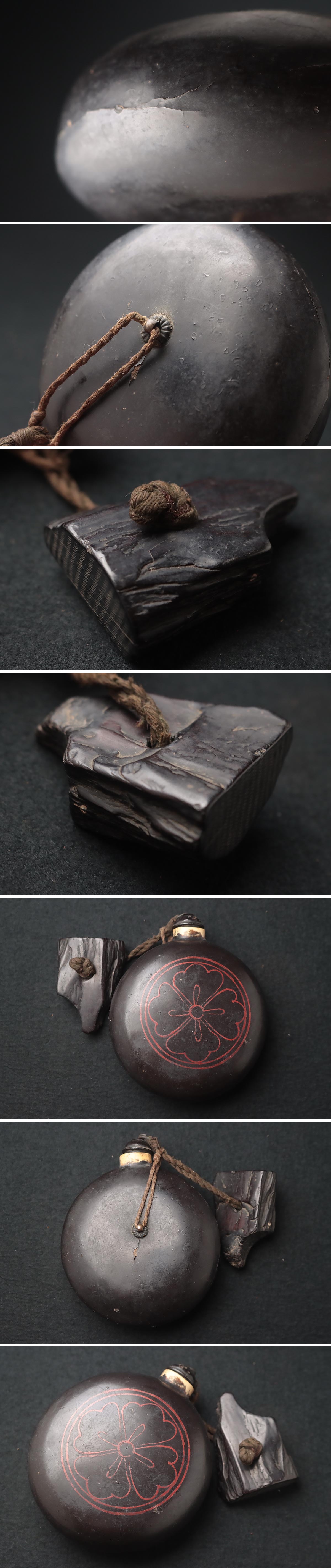 | ◆ 時代 火縄銃用 黒漆塗 定紋入 骨縁 火薬入 古木根付・火縄銃口火薬・弾薬入・煙硝入 武具 刀装具 小道具 古道具 古美術 ◆
