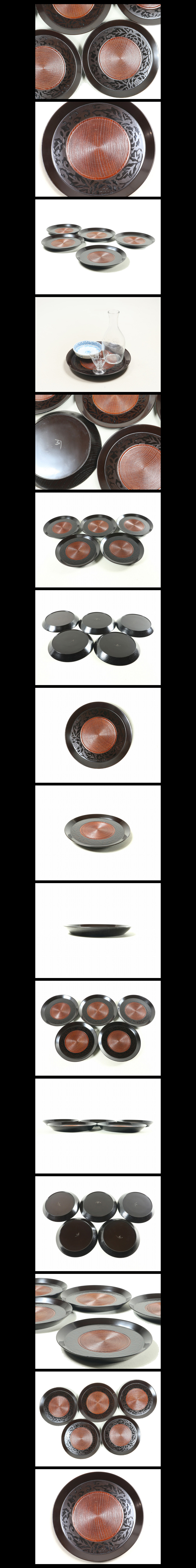 ●c4148●【黒蒔絵銘々盆5客/牡丹唐草蝋色黒真塗溜地木目千筋/酒器盆煎茶盆菓子盆木皿小振丸盆闇蒔絵】検お茶会煎茶道具茶懐石道具●西瓜●