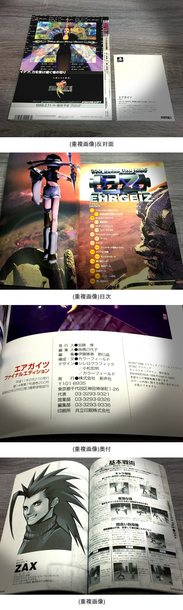| ------------------------------------------------------------------------ ж ж ж 商品について ж ж ж ------------------------------------------------------------------------ ◆ 「 ゲーメスト2月28日号増刊 EHRGEIZ FINAL EDITION 」 当時 中古を入手したもので 元々の仕様を知らない為、 欠品 や 欠落箇所があるのか など 一切不明です。 ◆ 「 エアガイツ の 宣伝用印刷物 」 (ポストカード型の広告?) 当時 新品で入手した ワンオーナー品です。 シワ、折れ、角折れ、などあります。 いずれも 入手より経年しており、記載以外にも 初期、経年 による劣化、及び 保管時、取り扱い時などのダメージ必至です。 ※ 商品は 画像1枚目のもので全てです。 ※ 画像は 実物よりきれいに写ってしまう部分があります。 また、最初の検品・出品から 時間が経っているものは、掲載画像・説明にはない 劣化 及び ダメージの増加 など 必至です。商品状態は現物優先です。 ※ ペットなし、非喫煙環境です。 |