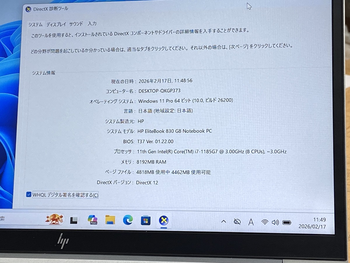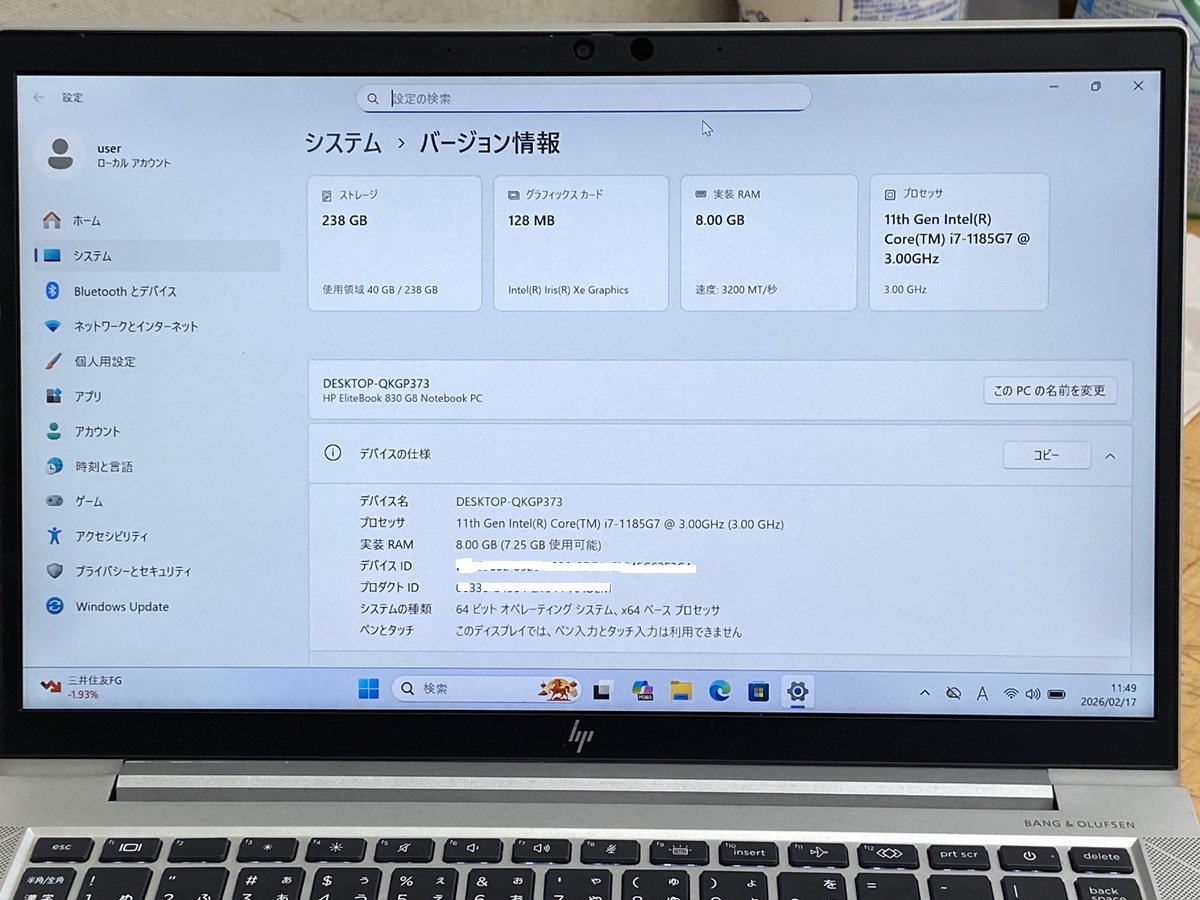 ノートパソコン中古 i7第11世代 i7-1185G7 HP EliteBook 830 G8 Notebook PC i7 11th gen laptop メモリ8GB NVMe 256GB ノートPC