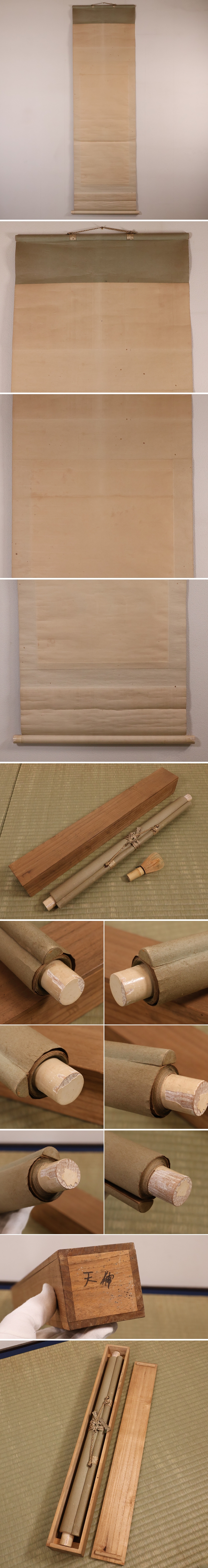 変色、しみ、よごれ、シワ折れ、表装裏上部紙の亀裂、軸先の剥落あり