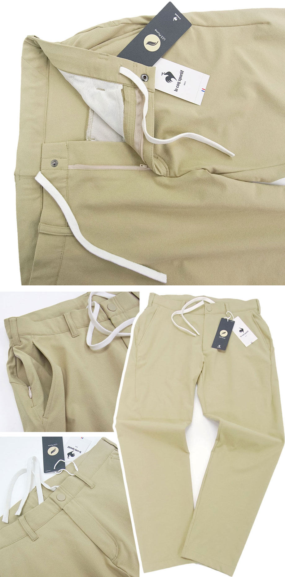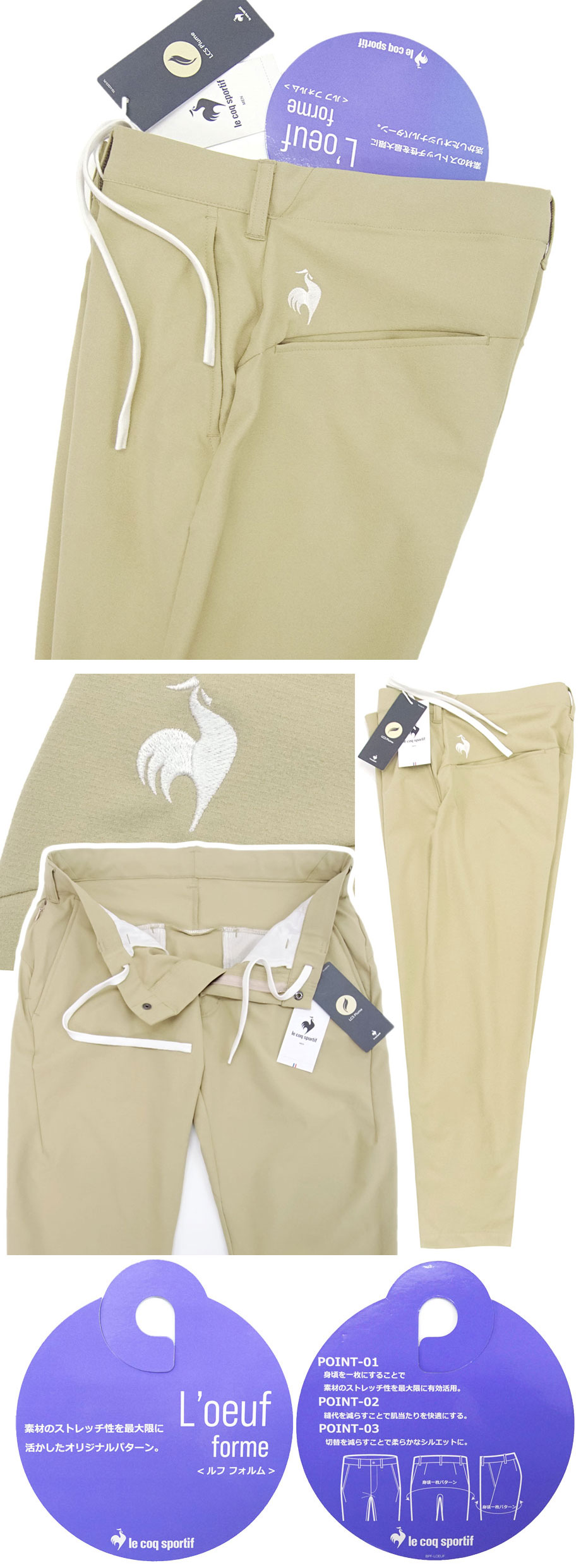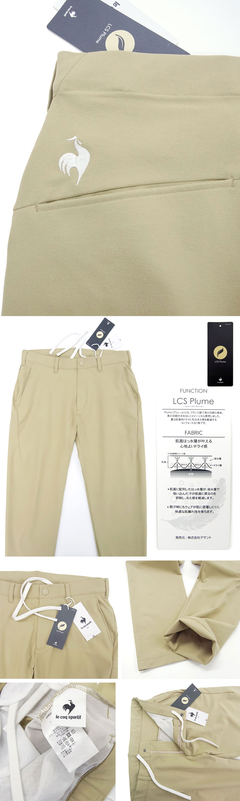 デサント製造の国内正規品。フランスの歴史あるブランド「ルコック スポルティフ」。吸汗速乾に優れ、最適な体温維持を可能とした高機能素材を使用。とても軽やかな生地は伸縮性に優れたスーパーストレッチ、かつウエストは約6cm伸縮するウエストストレッチで快適にフィットします。春夏~秋までスリーシーズン対応。やや薄手でサラリとドライな肌触り。股下は「9分丈程度(アンクル丈)」で裾上げ済み。裾補正なしで届いてすぐにご活用いただけます。素材のストレッチ性を最大限に活かし、デサント社独自の研究により生み出した立体裁断パターン【L'oeuf forme(ルフ フォルム)】。ベルトループを備え、ゴルフ等のアクティブなシーンからビジネスカジュアル等にもご活用いただけます。夏場のクールビズパンツとしては特にお薦め。ウォッシャブル ご家庭の洗濯機でお気軽に洗濯可能。派手めの色柄のものと比較してセール購入の難しい品かと思います。どうぞお見逃し無く。(並行輸入品ではなく、国内の大手スポーツショップ等で販売される国内正規品となります)