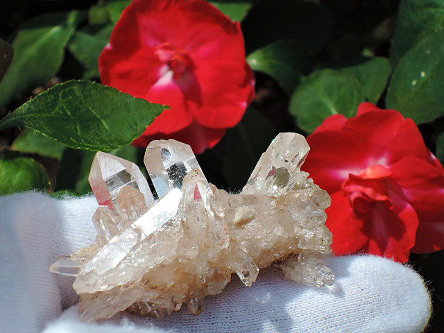 水晶は地中で育っているので、お水が大好きです。あと、植物に触れさせてあげても良いです。