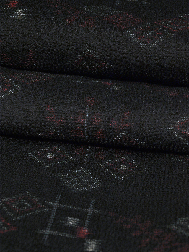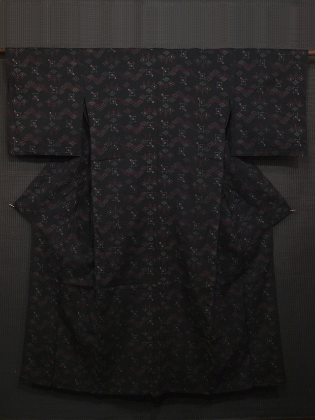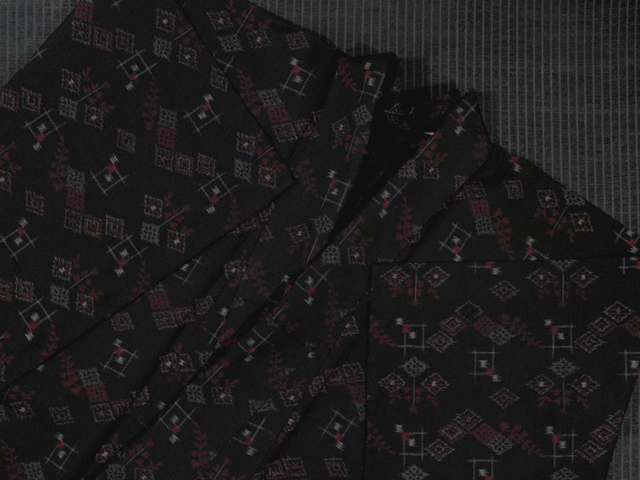 黒色の地に、絣で菱や井桁(いげた)などの文様が織り込まれている、縮みです。単衣仕立てです。 シックで小粋な格好良さがあります。深めのたてシボのあるややシャリ感の強い地風です。 ユーズド品です。衿裏が全体的に黄変気味で、こまかなうすよごれがちらほらとあります。そのほかに目につくしみやよごれ、褪色などのダメージは見あたらず、きれいな状態です。 |