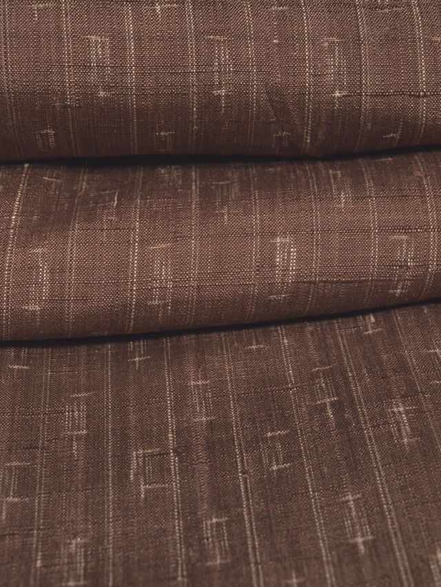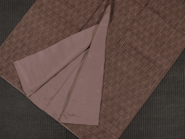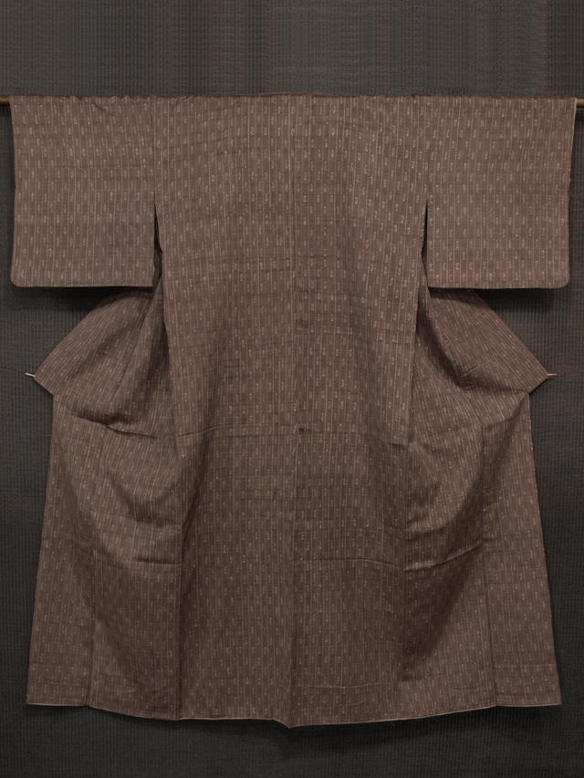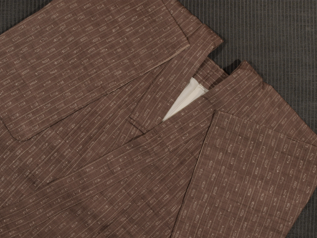 淡い紅檜皮(べにひはだ)色の地に、絣で幾何学的な文様が配されたたて縞の文様が織り込まれている、紬です。袷仕立てです。 昭和初期ごろにつくられたと思われるアンティークのお品です。ややざっくりと、ほっこりとした手ざわりの紬地で、古手の織味が素敵です。 胴裏が全体的にうっすらと黄変し、腰下付近で 1 か所接ぎが入っているほか、直径約 1-5cm のうすじみが 2 か所あります。また八掛の裾へりに直径約 3-5mm のスレががちらほらとあるほか、右後袖の袖口下のへり裏に長さ約 3cm のすり切れが 1 か所あります。表地はきれいな状態ですが、状態ランク=「D」のご着用対象外、リメイク素材用とさせていただきます。 |