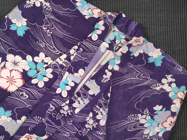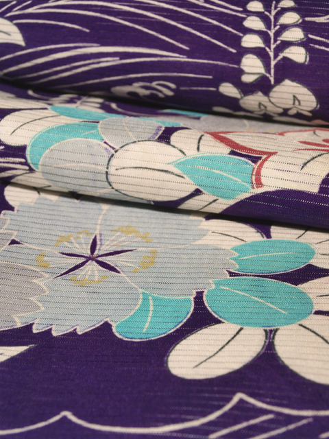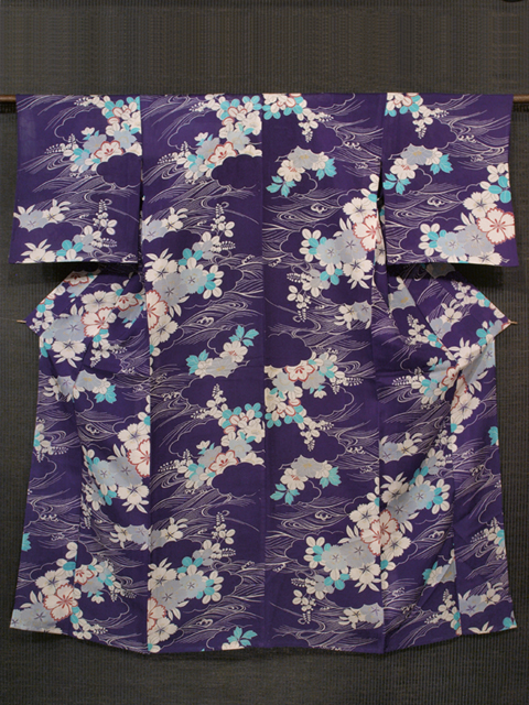 | 詳細 | 紫色味の強い鉄紺色の地に、立波と桔梗、萩、撫子などの草花の文様が染められている七本絽の小紋です。単衣仕立てです。 大正~昭和初期ごろにつくられたと思われるアンティークのお品です。艶やかでとても優雅な和の趣きが感じられます。袖が中に約 30cm 織り込まれて縫い止められていますので、糸を解けばその分の袖丈がかんたんに出せます。 使用感はほとんど感じられません。文様の白色地にくすみ、全体のところどころにごくこまかな色うつりが若干ありますが、そのほかに目につくしみやよごれ、褪色などのダメージはなく、この時代のものとしてはたいへんきれいな状態です。 |