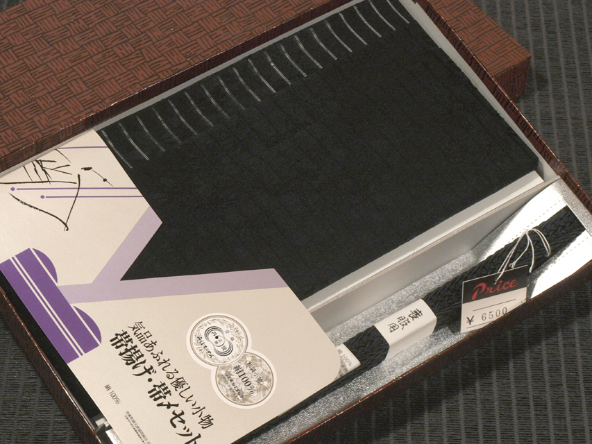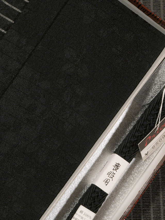黒色の地に萩の地紋が織り出された、絽縮緬(丹後縮緬)の帯揚げと、同じく黒色の地に抽象的な文様が組み込まれた変わり平組(メッシュ)の帯締めのセットです。夏季の喪服用です。京都・中京区の和装小物の卸元「京都和装卸元協同組合」さんで企画販売されたお品です。 未使用保管品で、しみやよごれ、褪色などのダメージもありません。パッケージなどには変色がありますが、お品は新品同様です。 |